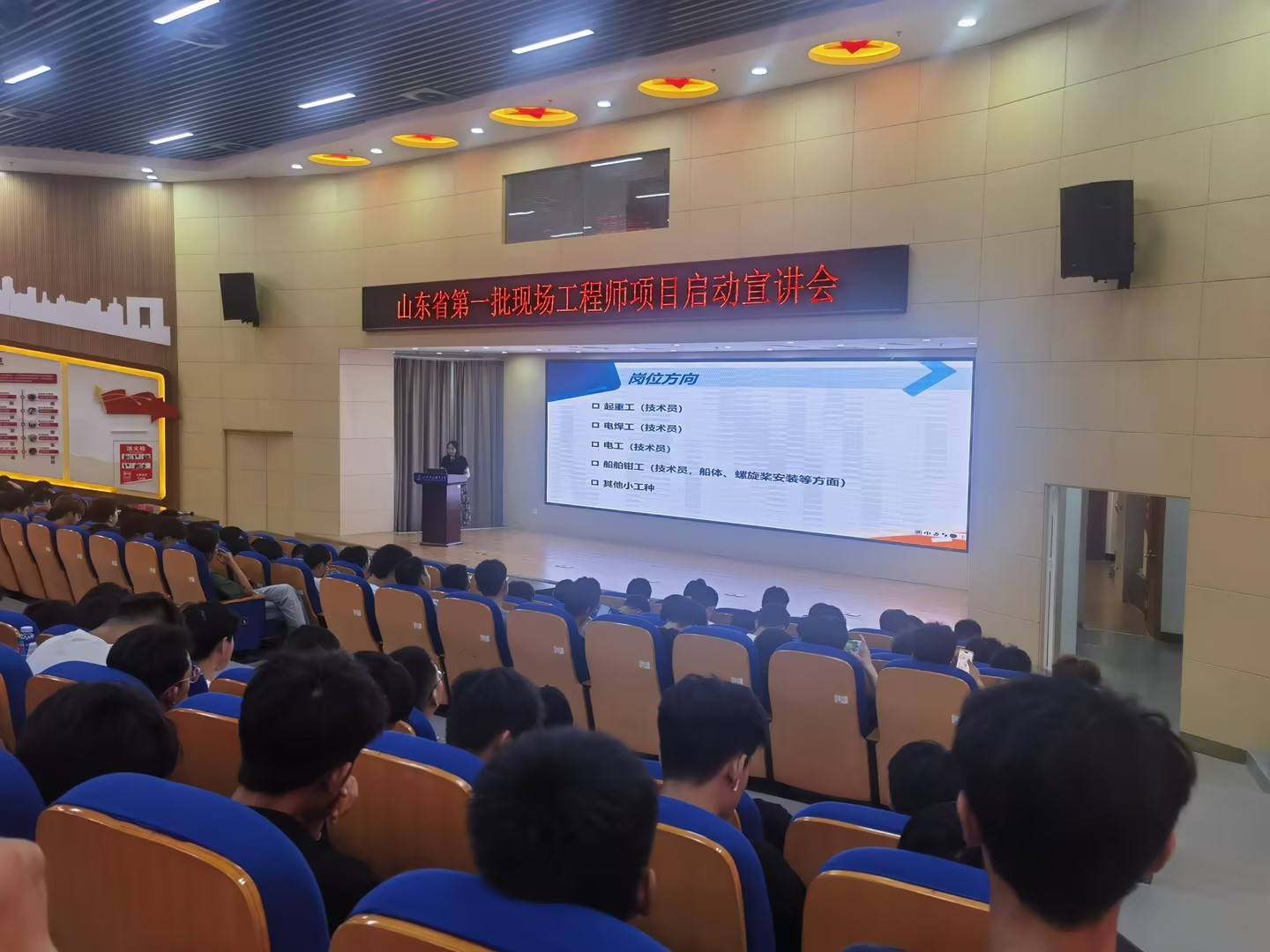 本次现场工程师项目宣讲会面向机械制造及自动化、机电一体化技术、电气自动化技术、工业机器人技术4个专业开展,共542名学生分两批参加了宣讲会,参会的还有部分专业教师和辅导员。宣讲会的内容由智能制造学院专业教师和中船集团工程师共同商定,电气教研室李娟老师进行了宣讲。