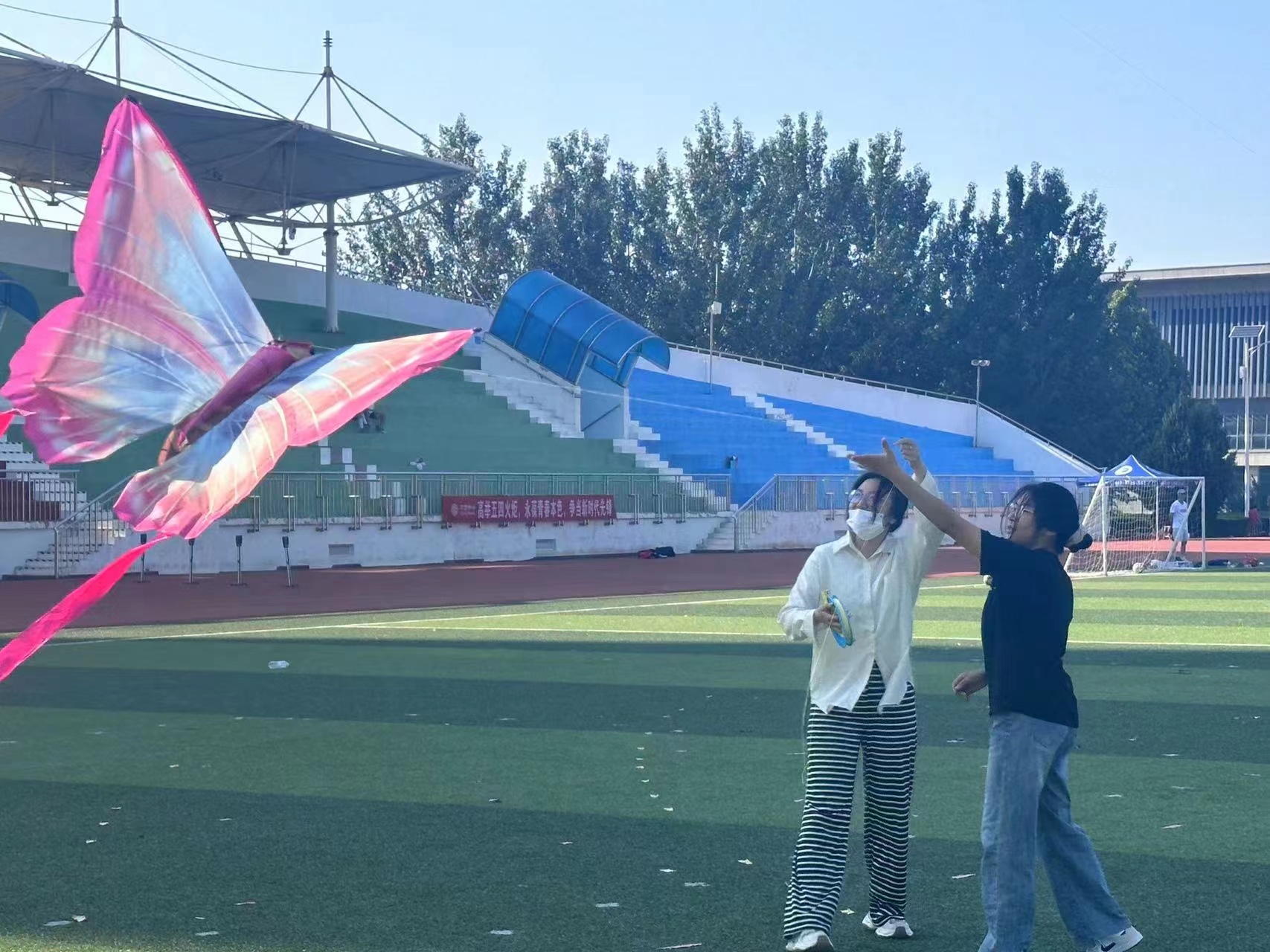 “放飞梦想,心随风动”放风筝趣味活动。活动从同学们的“艺术创作”开始,蘸上颜料,画笔涂抹,同学们在风筝上留下鲜艳的色彩,或是勾勒喜欢的图案,或是写下对未来的期许。当五彩缤纷的风筝在空中翩翩起舞时,它们不仅装点了蔚蓝的天空,也承载着每位同学对未来的美好憧憬。