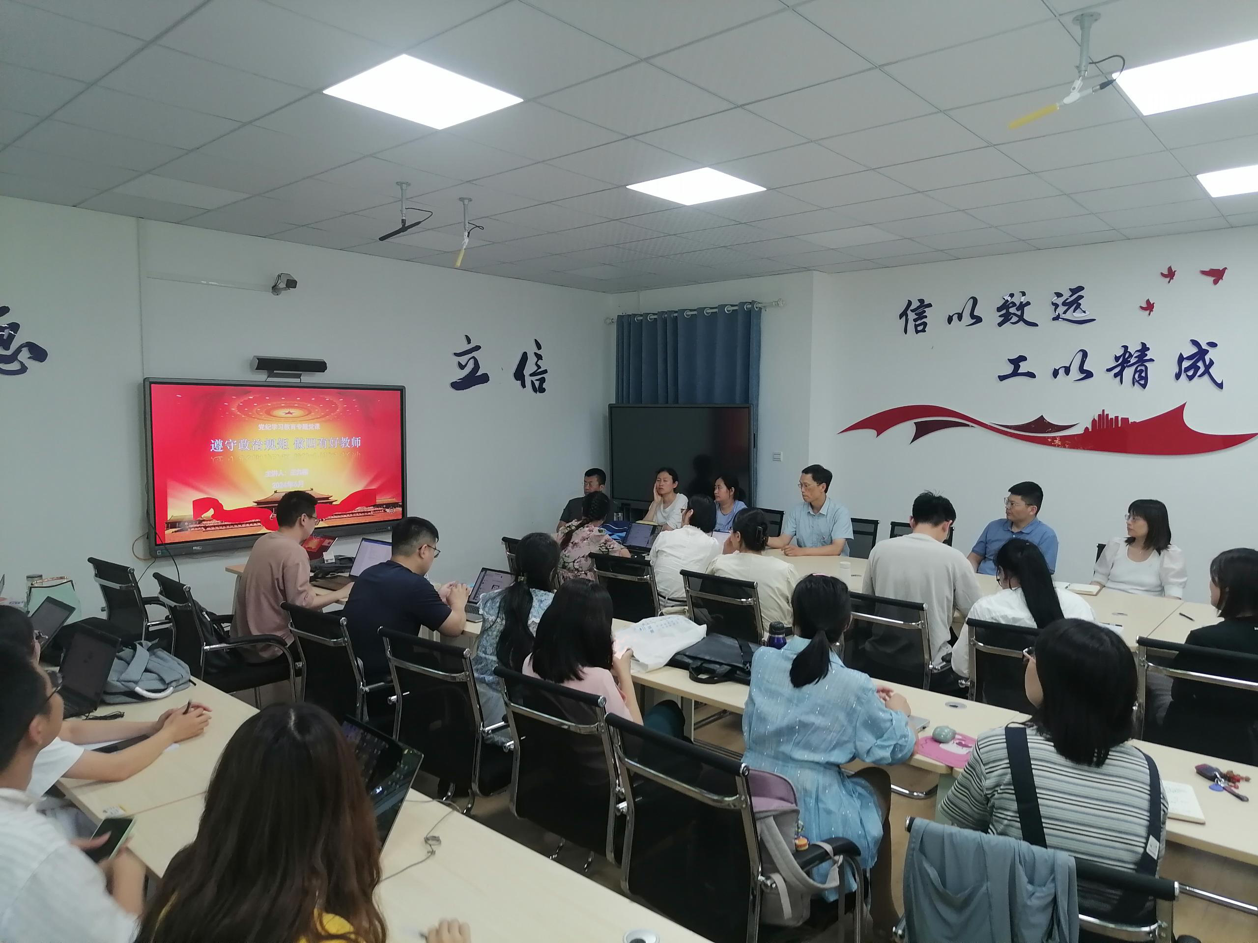 本站讯 为进一步推进全面从严治党,深入学习领会新修订的《中国共产党纪律处分条例》(以下简称《条例》)的内容和要求,增强党纪规矩意识,6月24日,信息工程学院党总支书记王九福以《遵守政治规矩,做四有好教师》为题,为学院全体教职工讲授了一堂深刻的党纪专题党课。