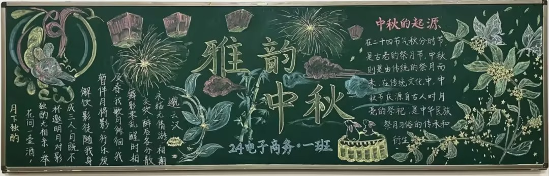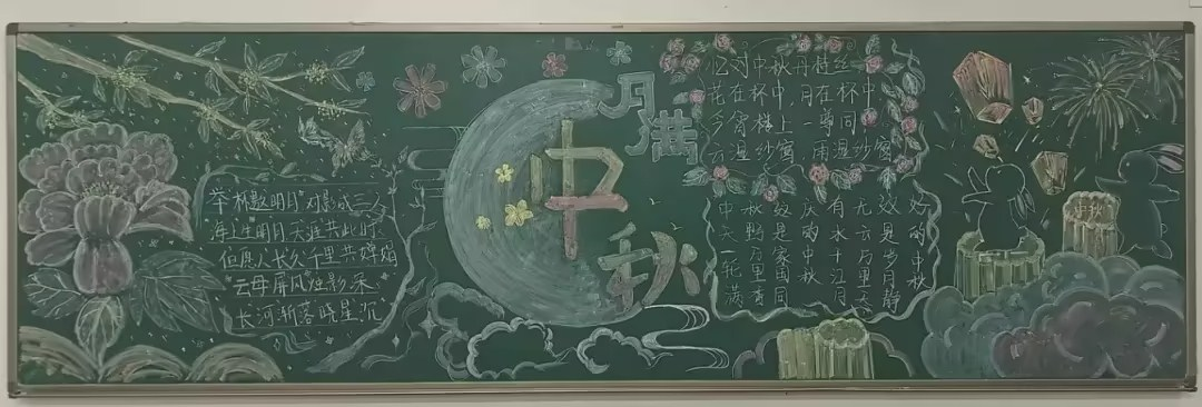 每一块黑板报都凝聚着不同班级同学们的创意和心血。他们从不同的角度诠释中秋的内涵,有的从传统文化的角度出发,介绍中秋的起源、习俗等丰富的文化知识;有的则结合现代元素,将中秋与当下的生活、情感相融合,体现出时代的气息。这些黑板报不仅是一幅幅美丽的图画,更是同学们对中秋佳节的独特理解与感悟的结晶。