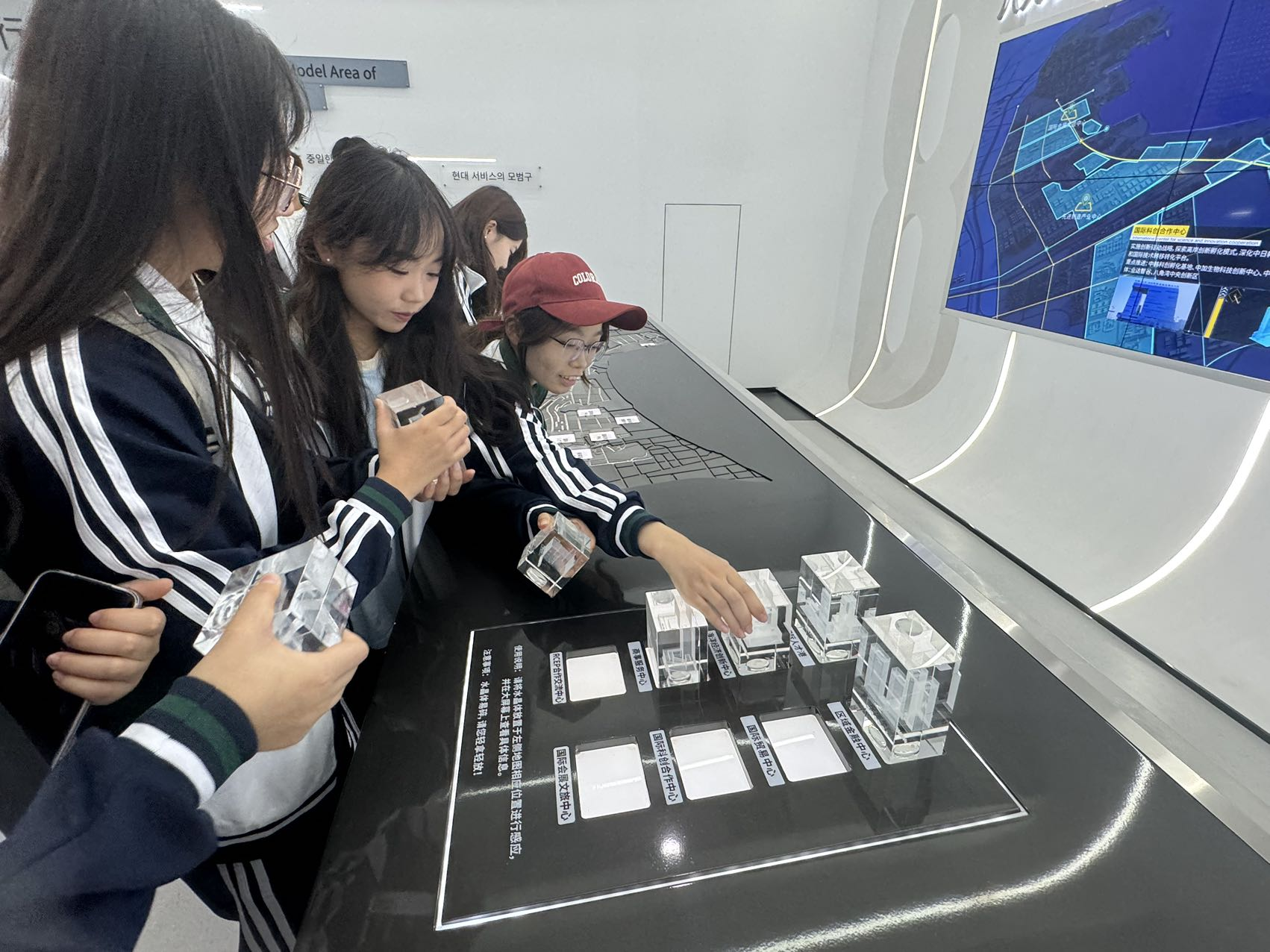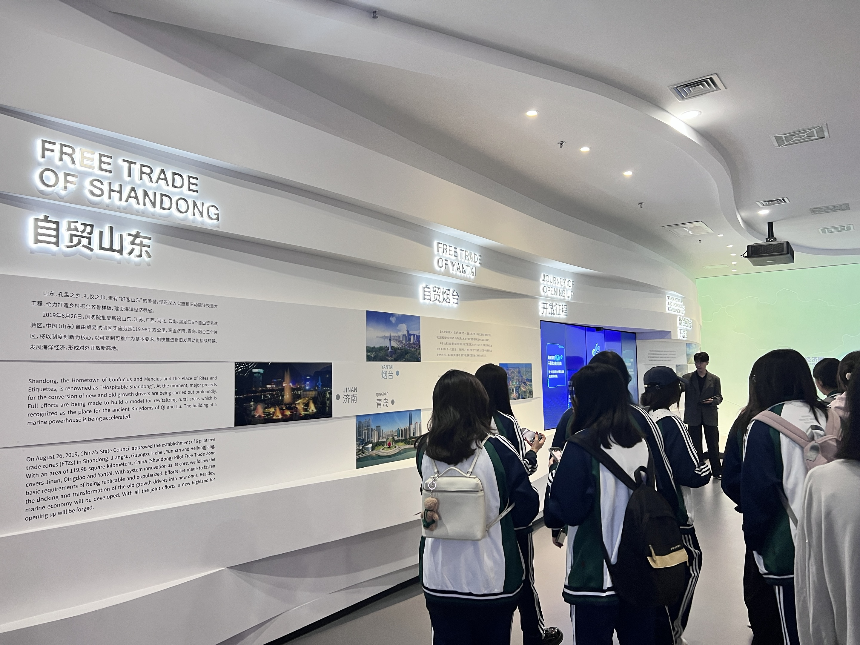 在展区内,讲解员详细介绍了自贸区的成立背景、历史沿革、未来规划、特色优势及规模范围。师生们观看了未来影院2050,通过生动的案例和数据展示了自贸区在国际贸易、吸引外资和产业升级方面的显著成效。
