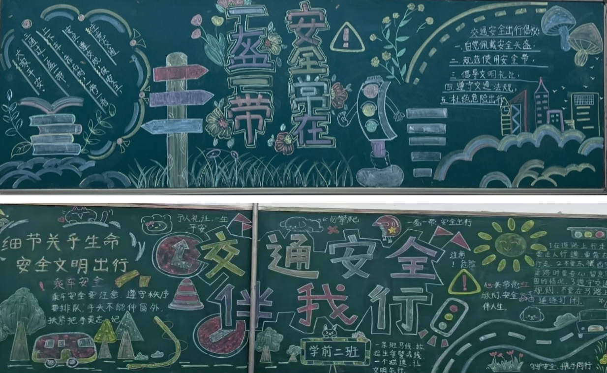 黑板报作品在精心设计的知识板块中,详细阐述了电动车驾驶应遵循的准则,诸如佩戴头盔、不能载人、超速等关键要素,并配以醒目标题,传递警示教育意义。