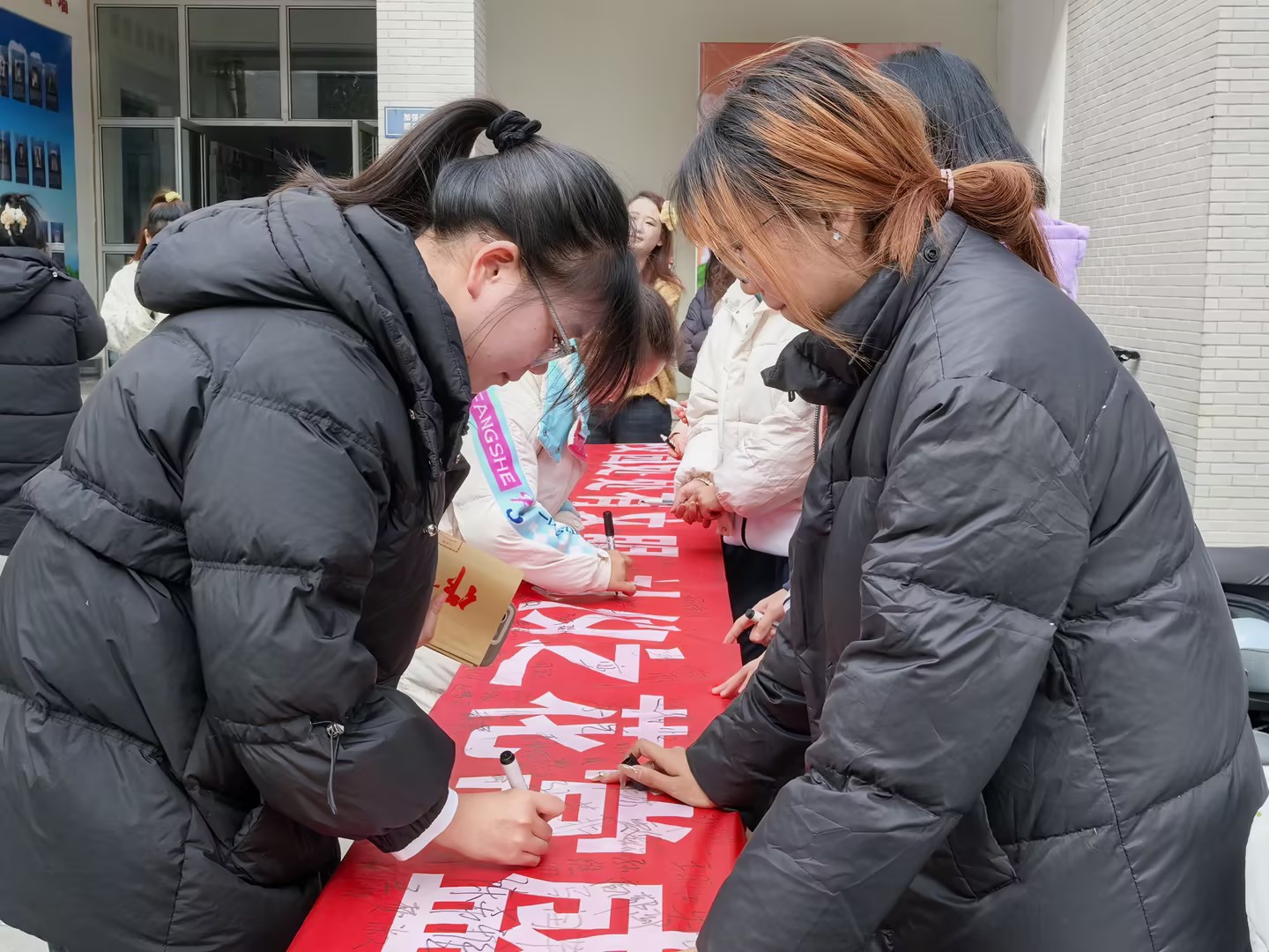 活动伊始,学院志愿者引领同学们踊跃分享身边的文明小故事,并描绘出他们心目中的“文明大学生”形象。随后,志愿者通过边示范边讲解的方式,向同学们传授了相关的礼仪知识,现场气氛热烈而有序。随后,同学们纷纷来到签名区,庄重地签下自己的名字,以此表达自己对践行校园礼仪的坚定决心。签名完成后,同学们齐心协力将这块承载着大家承诺的签名布悬挂于校园内的醒目位置,既时刻提醒自己,也让更多的师生能够目睹这份承诺,共同维护和弘扬校园的文明礼仪。