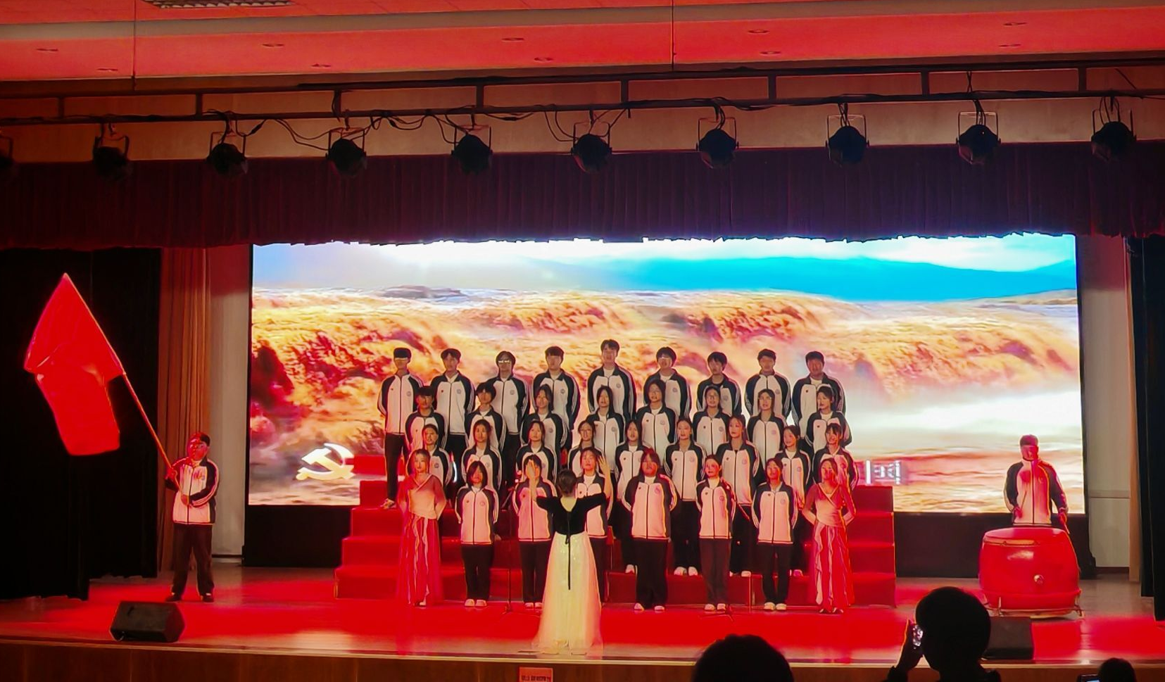 比赛现场,学院16个新生班组成16支队伍齐聚一堂,共同奏响一曲曲红色时代华章,他们用嘹亮的歌声向经典致敬,为现场观众带来了一场精彩的视听盛宴。