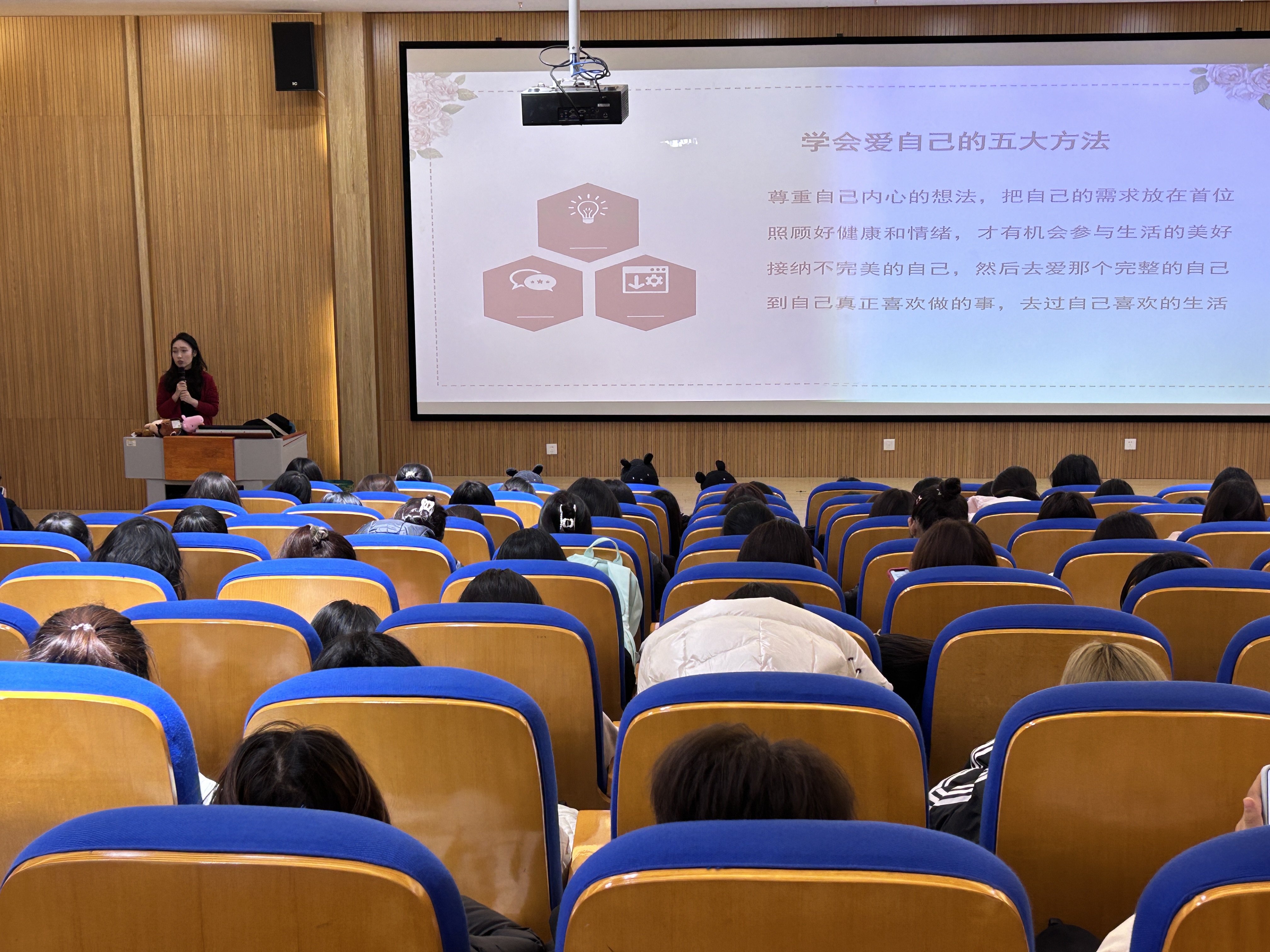 讲座吸引了众多学生踊跃参与。本次讲座邀请到学校大学生心理健康教育中心张莉敏老师担任主讲,围绕女性在大学生活及未来社会角色中的定位与发展,将自尊、自爱、自强、自立等核心内容进行了深入剖析和精彩演绎。张老师通过生动的案例与深刻的分析,引导女大学生正确认识自尊自爱的内涵,强调女生在追求学业与事业的过程中保持独立人格与自信品质的重要性,并鼓励女生要勇于追求自己的梦想,敢于挑战自我。