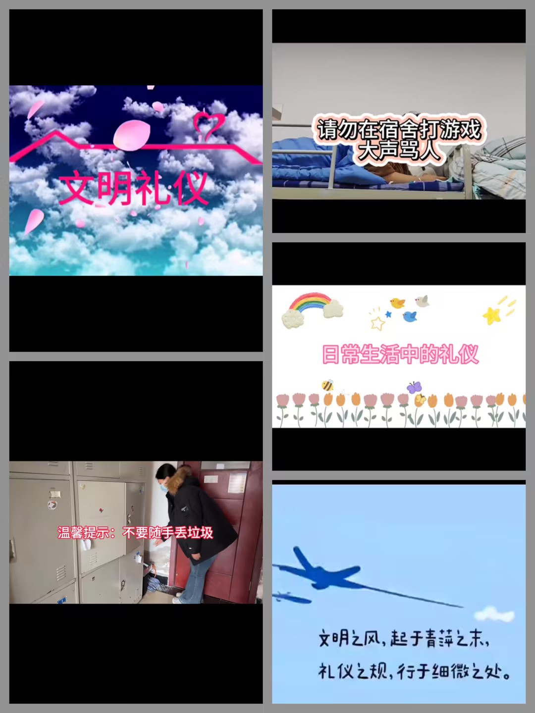 文明礼仪作为社会交往的基石,涵盖了日常生活的方方面面。此次活动中,学生们以创意视频的形式,生动展现了他们对文明礼仪的独到见解和深刻感悟。同学们纷纷挖掘宿舍、教室、校园内外的文明小故事,通过镜头语言描绘出他们心目中的“文明大学生”形象,传递出文明礼仪的温暖力量。《文明之风,起于青萍之末;礼仪之范,彰显于细微之间》这一精心制作的小视频,巧妙地将镜头聚焦于校园环境这一广阔舞台,通过生动演绎从拒绝随意丢弃垃圾到积极践行节约用水用电的系列场景,深刻传达了珍视自然环境、倡导资源节约的核心理念,旨在携手共建一个和谐美好的校园家园。另一部名为《文明礼仪》的小视频,细致入微地将视角转向了温馨的学生宿舍,以章节形式巧妙布局,正反对比鲜明地展示了种种行为举止。视频中,不仅倡导了尊重他人、善用礼貌语言的社交风范,还颂扬了乐于助人、温暖人心的美好品质,全面而深刻地诠释了文明礼仪在日常生活交往中的重要作用与深远意义。
