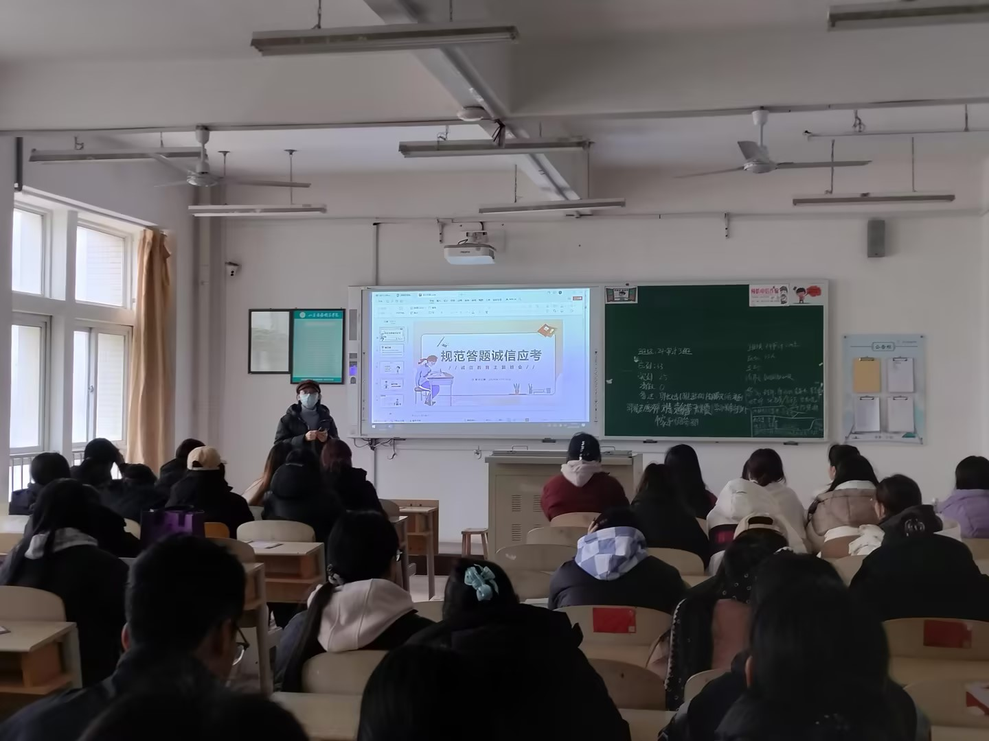 在班会上,辅导员分别介绍了英语四级和六级的考试流程,以及考试过程中的注意事项,提醒同学们要合理安排时间,把握好做题速度。随后,老师又给大家强调了英语四六级考试的重要性和意义。英语四六级是学生职业发展和未来学习的重要基石,掌握英语能力对于拓宽就业渠道和提高综合竞争力至关重要。辅导员还通过分析考试违规处理的案例告诫同学们要严守考纪,杜绝舞弊,诚信考试,弘扬清新学风。以生动直观的方式阐述了诚信考试的重要性。通过列举校园内外鲜活的实例,深刻剖析了作弊行为的严重危害及其潜在的不良后果。学生们全神贯注地聆听讲解,深切体会到了诚信考试在个人成长和社会发展中的重要作用。