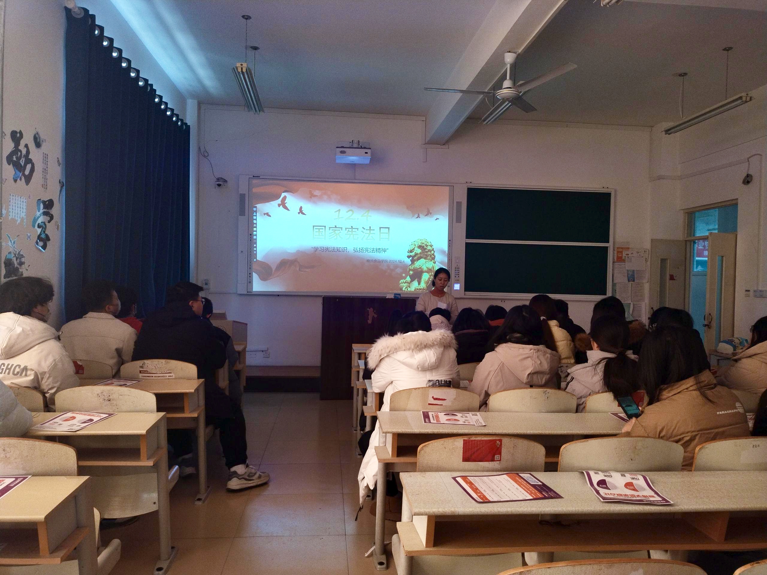 教师引领,筑牢理论根基。在活动中,学院教师充分发挥引领作用,将宪法知识融入课堂教学,并精心组织主题班会。在课堂与班会的学习过程中,深入学习宪法在国家治理体系中的核心地位以及全面依法治国的重大意义,为学生们奠定了坚实的法治理论基础。