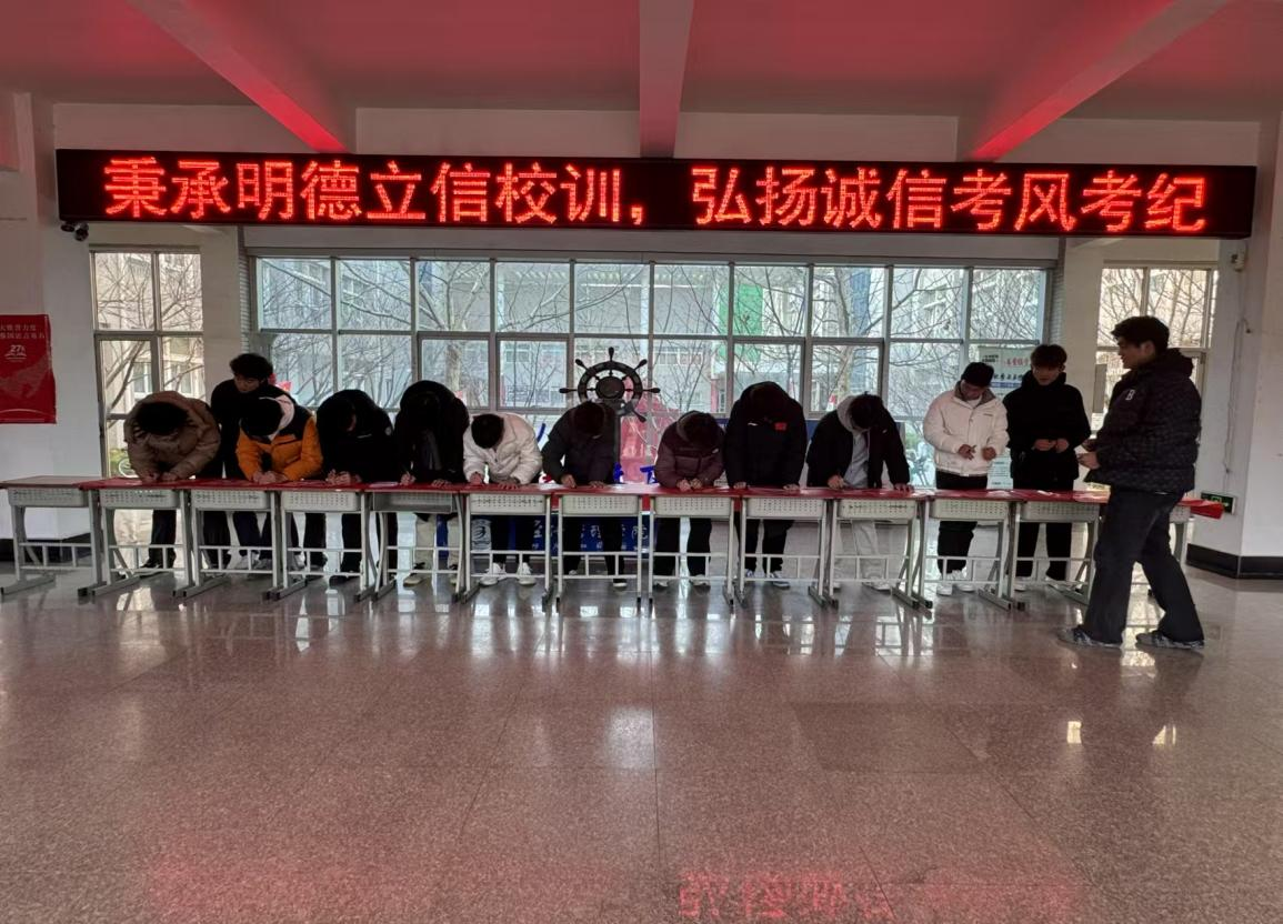 以班级为单位,组织学生在《诚信考试承诺书》上签字,承诺在考试中严格遵守考试纪律,不作弊、不抄袭。组织开展诚信考试横幅签名和宣誓活动,呼吁广大学子坚守道德底线,增强诚信意识,营造诚信考试氛围。