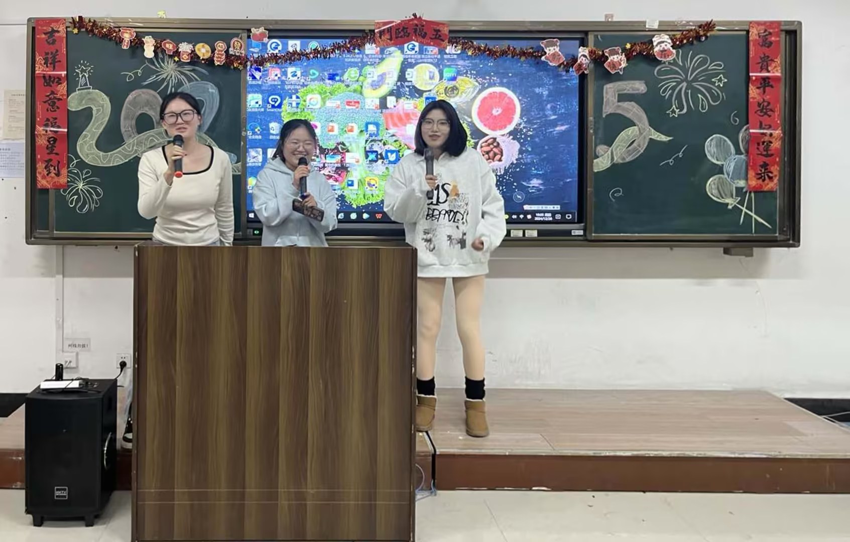 经过数天精心创作,一些班级精心装扮了喜迎元旦的黑板报。有的用绚烂色彩勾勒出金蛇戏珠与红灯高挂的画面,有的以立体剪纸风格展现爆竹声声迎新年的热闹。24设计2班以金蛇盘绕为主线,周围点缀传统红灯笼,将传统文化与生肖元素巧妙融合,展现出对新年的美好期许。24建工1班将爆竹元素与灯笼线条结合,用细腻笔触描绘出高空爆竹绽放的场景,寓意学院在新的一年如爆竹般蓬勃发展。