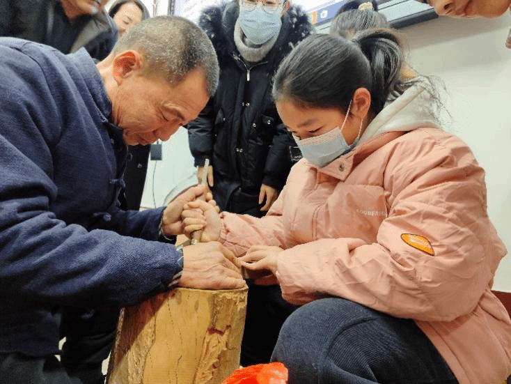成立仪式结束后,非遗传承人杨龙老师带领孩子们体验了果模雕刻、磕巧果等传统技艺。孩子们在杨龙老师的指导下,亲手制作小巧精致的果模雕刻品,感受着非遗技艺的独特魅力。在每一刀雕刻中,孩子们体验了非遗手艺,在传统文化的深厚底蕴中找到了自我表达的方式。“我从来没有想过,原来雕刻果模这么有趣,也很有挑战性!”一位参与的孩子激动地说,“以后我一定要把这项技艺学好,做一个非遗传承人!”