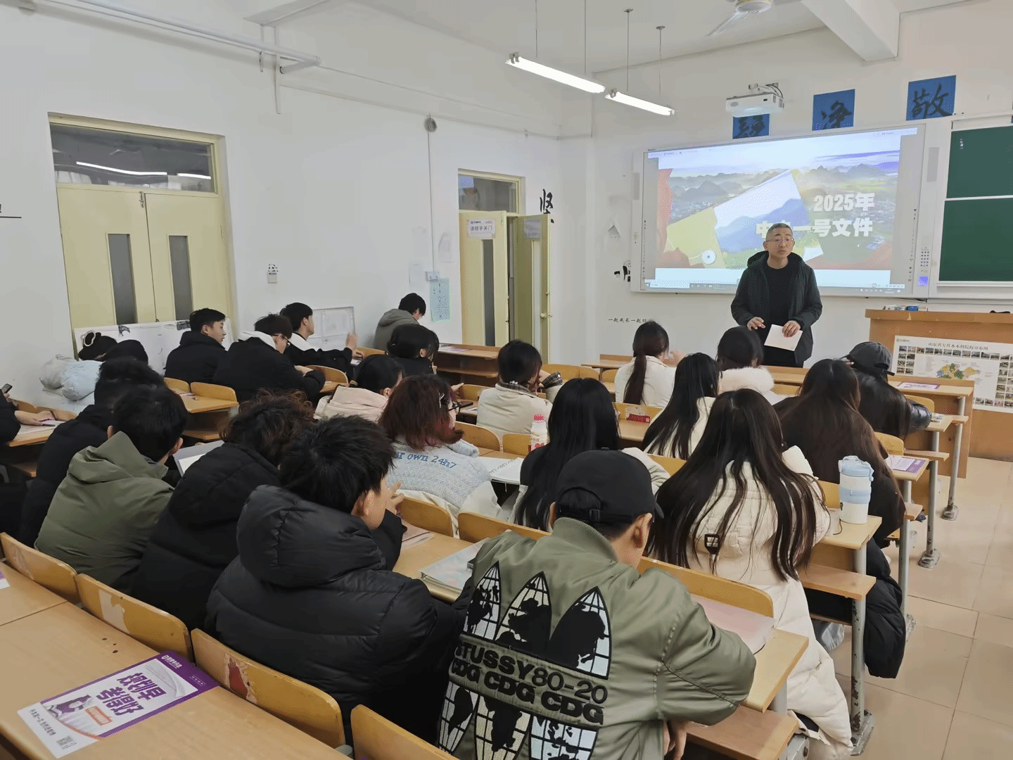 班会上,班主任首先强调了中央一号文件在农业农村发展中的指导性地位。2025年中央一号文件继续以乡村振兴为核心,明确了“两个确保”“三项提升”和“一个推动”的总体要求,为农业农村发展指明了方向。作为粮油食品学院的学生,要深刻认识到自身肩负的责任与使命。粮油食品行业是保障国家粮食安全的重要领域,专业学习和未来职业发展与“三农”事业息息相关,同学们必须提高政治站位,增强服务“三农”的意识,将个人成长与国家发展紧密结合。