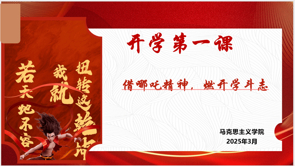 马克思主义学院教师开学第一课把中国传统优秀文化与新鲜案例电影《哪吒之魔童闹海》融入开学思政第一课中,让学生深处中国传统优秀文化的殿堂中,在学习过程中坚定中国特色社会主义文化立场,建立新时代文化自信心。全体思政课教师认真备课,将学生喜欢的传统优秀文化创新案例融入课堂教学,介绍新时代中国特色文化创新事迹,鼓励学生向榜样学习,成为中国特色社会主义文化的传播者和贡献者。引导学生在新形势下运用中华优秀传统文化塑造正确的世界观、人生观和价值观,用中华优秀文化中蕴含的哲学思想、道德规范帮助和促进学生形成良好的道德素质和道德修养。课后学生纷纷表示,会好好学习中国传统优秀文化中的思想观念、人文精神和道德规范,积极投身到中国特色文化创新建设中,勇担大学生的使命,用实际行动为国家文化发展贡献力量。