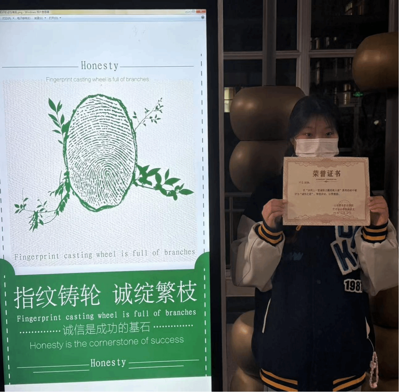 经过综合评选,最终评选出一等奖、二等奖、三等奖及优秀奖。在颁奖仪式上,获奖学生代表上台解读了自己的海报创作思想。一等奖获得者表示:“我的海报以‘诚信之树’为主题,通过描绘一棵茁壮成长的诚信之树,寓意诚信如同根基,只有根基扎实,人生之树才能枝繁叶茂。我希望通过这幅海报传递出诚信是人生成功的基石这一理念。”二等奖获得者分享道:“我的作品以‘诚信之光’为主题,通过光影对比,展现了诚信在黑暗中的指引作用。我认为诚信如同一盏明灯,能够照亮我们前行的道路,让我们在人生的旅途中不迷失方向。”