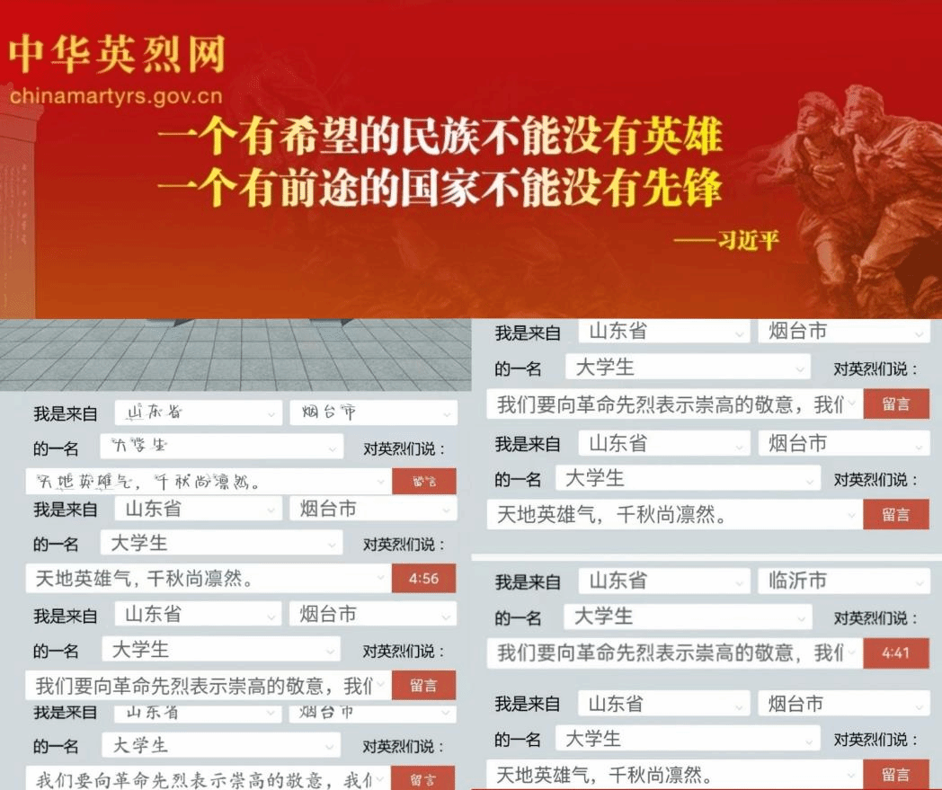 云端寄托哀思,红色精神传承。积极鼓励全体师生利用中华英烈网、地方纪念平台等线上平台,通过献花、留言寄语等“云祭扫”方式缅怀先烈、追思故人。学生在留言中写道:“英雄精神跨越时空,我们将以奋斗续写新时代答卷。”党员教师留言道:“清明怀故,铭记英烈前辈。”