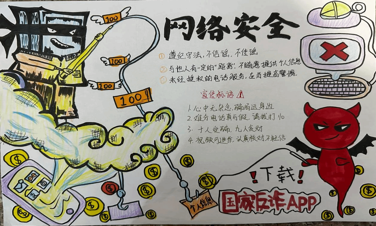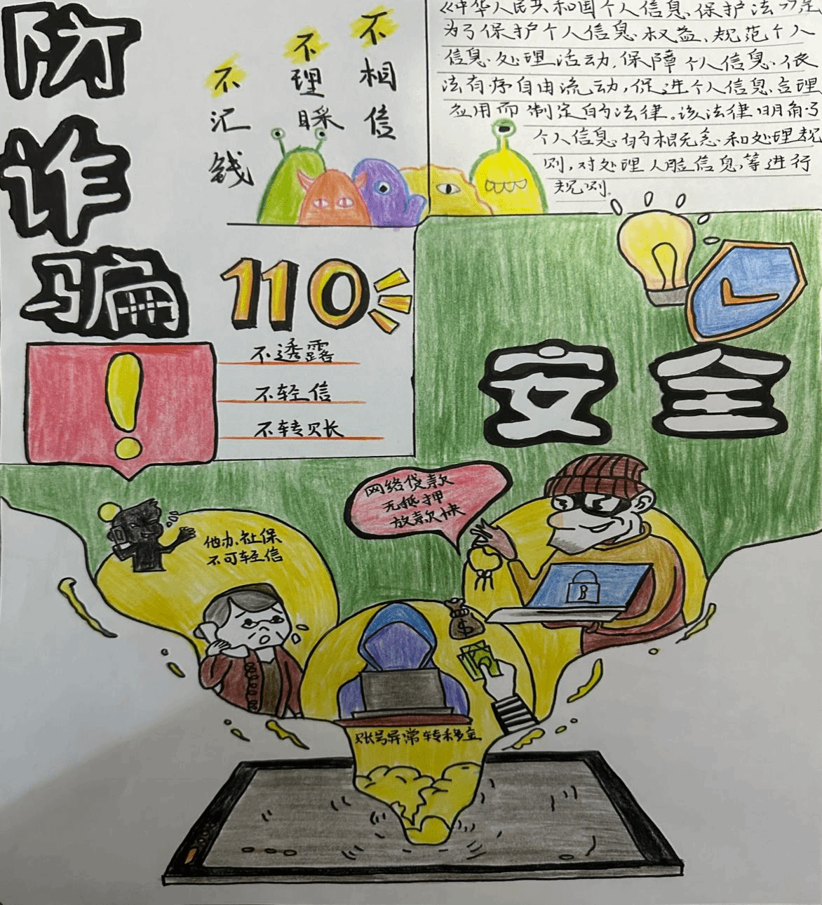 活动期间,同学们围绕刷单、网贷、冒充公检法等常见诈骗类型,以漫画、海报、水彩等多样形式创作,将安全知识与艺术表达完美融合,充分展现了同学们的艺术创造力与对安全问题的深刻理解。其中,24营销1班耿瑜辰的作品—《防范诈骗》,通过鲜明的主题、多元素的表现形式和具有视觉冲击力的色彩搭配,详细介绍了诈骗类型、应对措施等,让读者了解到诈骗手段的多样性、复杂性,从而在日常生活中保持警惕,不轻易上当受骗。经严格评审,最终《防范诈骗》《反诈骗有你有我》等作品获评一等奖,其余共20多部作品获其他奖项,获奖作品不仅展现了学生的艺术才华,更以生动形象的方式呈现了防诈要点。