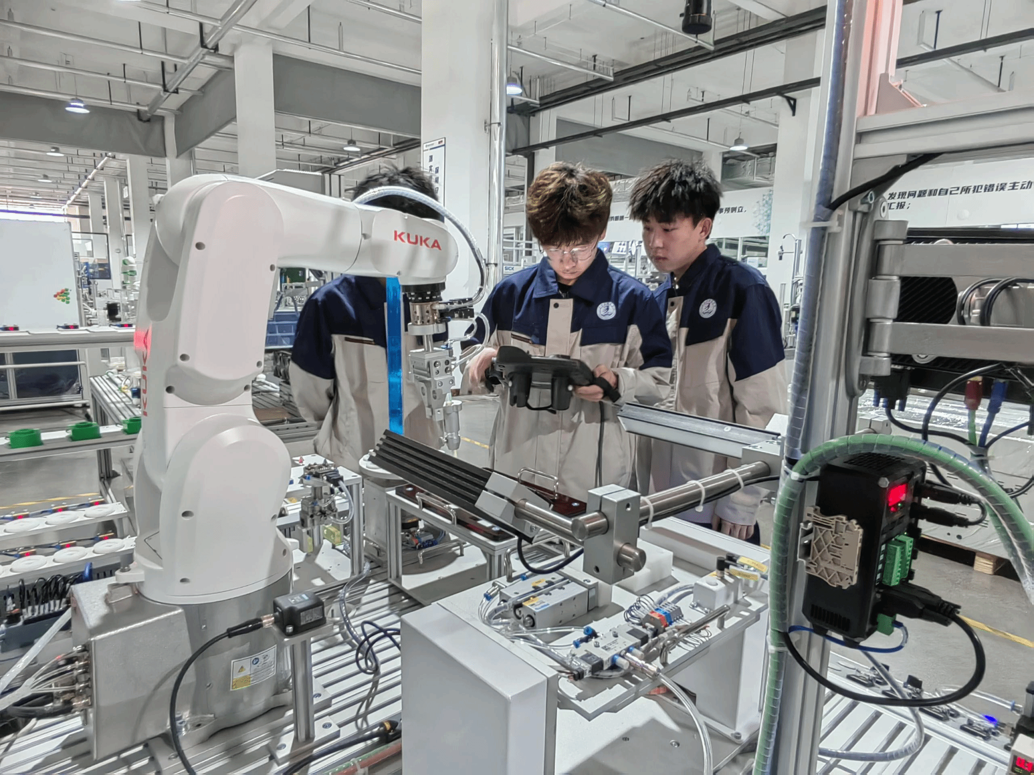 师生团队实地考察了企业智能工厂示范产线、工业机器人实训中心及中德技术协同创新中心,重点观摩了智能仓储物流系统、工业互联网平台实时监控、数字孪生技术应用等核心场景。结合智能制造装备技术、工业机器人技术等专业方向,就“智能产线集成设计”“工业大数据分析”等课程内容与企业工程师展开技术研讨。