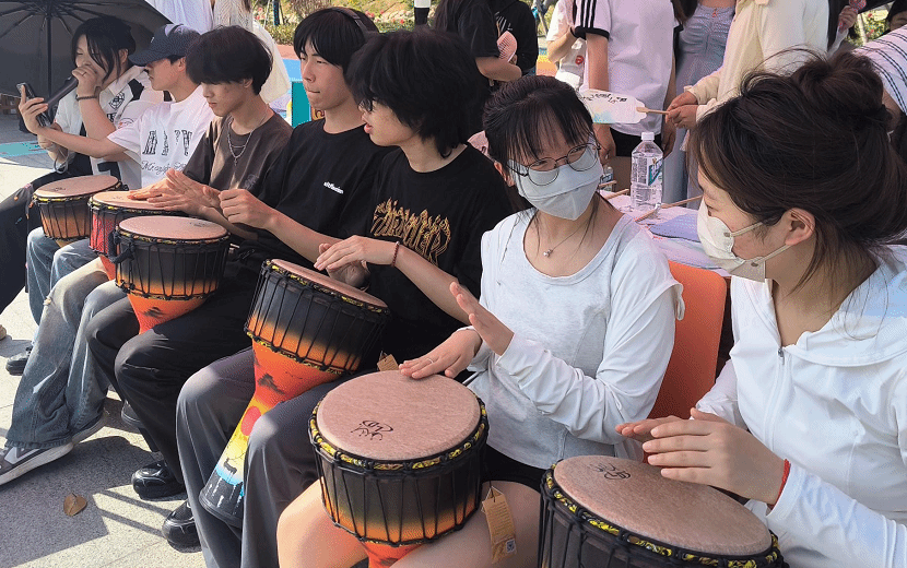 活动现场,学院特别邀请的乐队带来震撼的非洲鼓演奏,鼓点节奏明快、动感十足,瞬间点燃全场气氛。乐队成员还手把手教同学们击打非洲鼓,让大家沉浸式感受音乐的魅力与心灵释放的畅快。这场音乐盛宴吸引了全校师生驻足围观、踊跃参与,来自留学生学院的越南和老挝同学也被非洲鼓独特魅力吸引,热情投身其中,在欢快鼓点中实现跨文化的心灵交流。