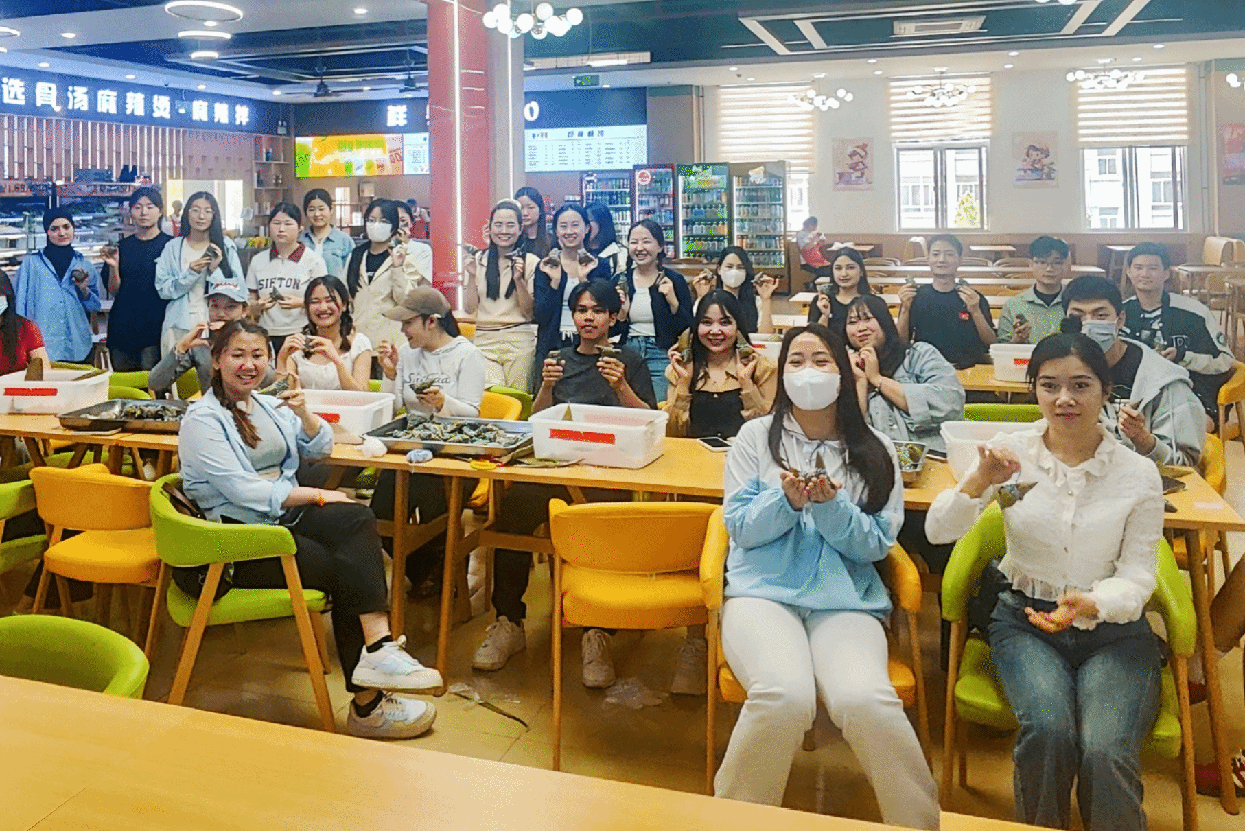粽香飘散,情谊绵长。活动当日,班主任于向宇带领留学生们齐聚学校餐厅,学习包粽子。餐厅工作人员详细讲解粽子食材特性及包制工艺,从粽叶挑选到绳子捆扎,耐心示范、悉心讲解。留学生们全神贯注聆听后,便迫不及待动手尝试。尽管起初手法生疏,粽叶不服帖、糯米易散落,但他们毫不气馁,在互助实践中不断探索,逐步掌握技巧,现场气氛热烈温馨,最终累计完成百余只饱含心意的粽子,深切感受到端午节粽子所蕴含的团圆与思念之情。