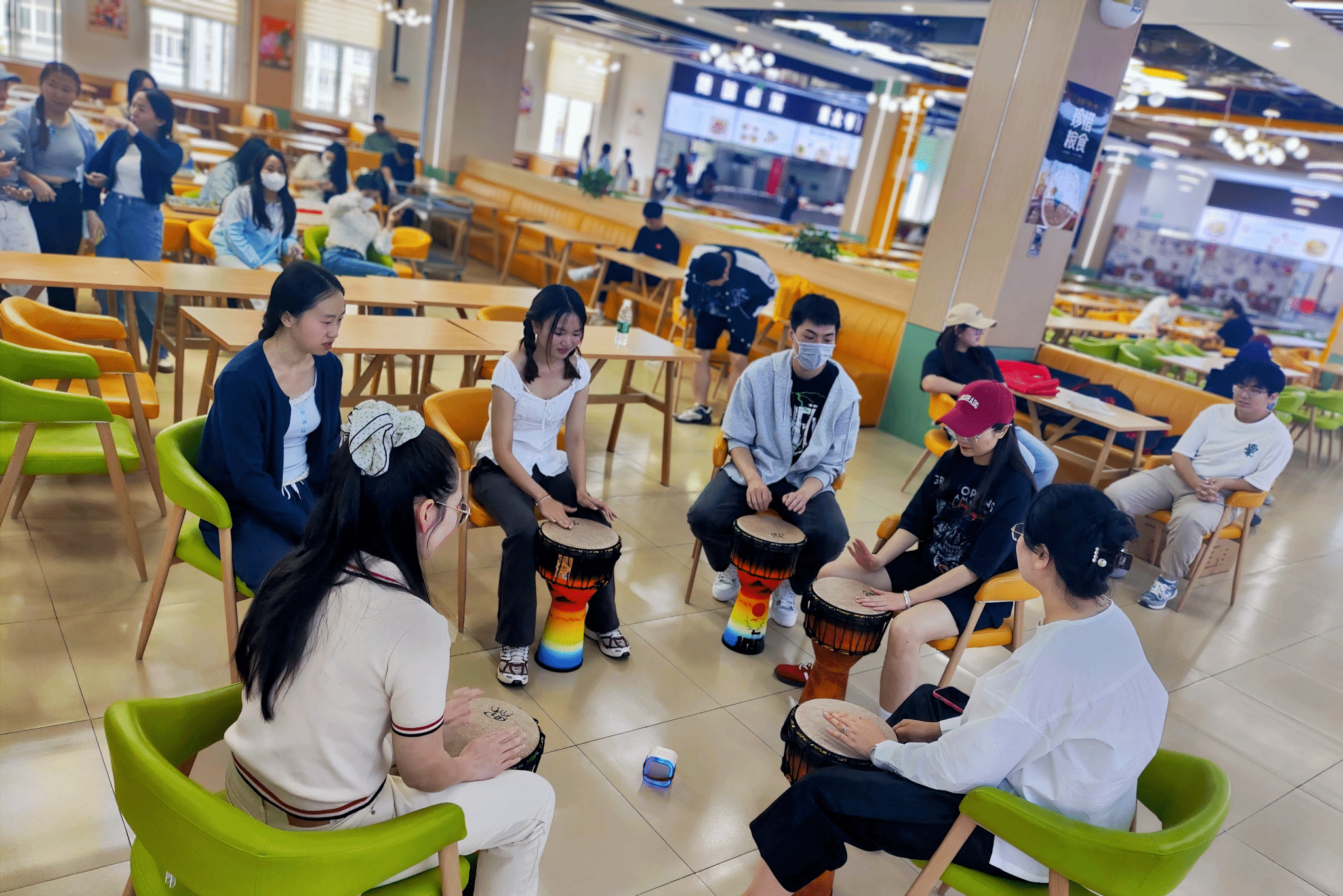 鼓声飞扬,文化共鸣。活动间隙,留学生们分组合奏非洲鼓《你笑起来真好看》。鼓点节奏明快,与传统节日氛围完美融合,形成独特文化共鸣。富有感染力的节奏在餐厅回荡,为活动增添活力,展现不同文化元素相互交融的魅力,释放出的热情与活力让整个现场沉浸在欢乐和谐氛围中。