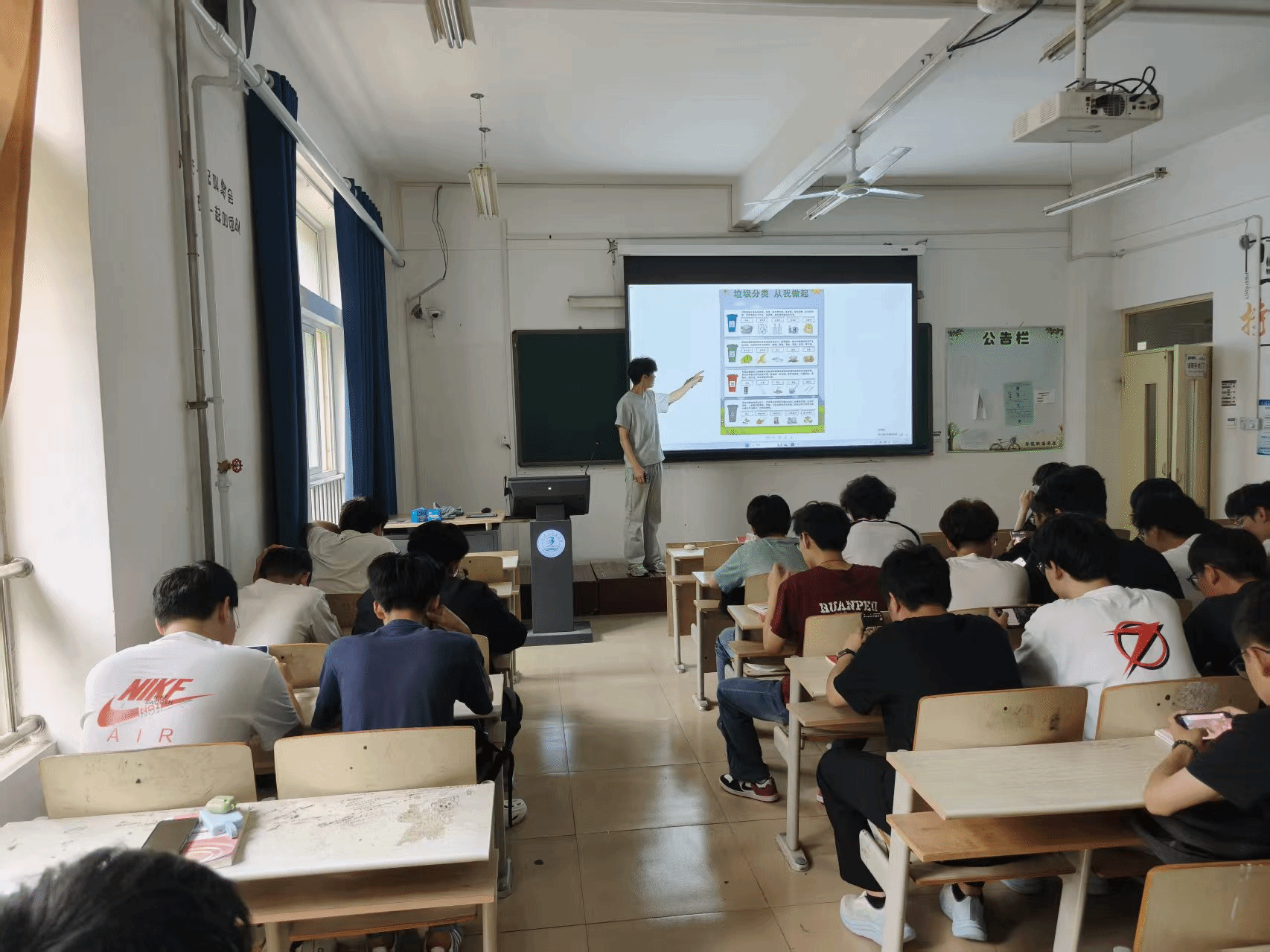 深化垃圾分类理念,知识普及是关键。学院面向所有班级组织开展了垃圾分类主题宣传活动。活动采用“集中宣讲+视觉传播”双轨并行的方式。集中宣讲围绕“为何分类”“如何分类”“分类意义”三大核心,用通俗易懂的语言详细解读了四类垃圾的标准与投放要求,并结合校园生活实例分析错误分类的危害,鼓励班级负责人化身“环保宣传员”,带动身边同学共同参与。