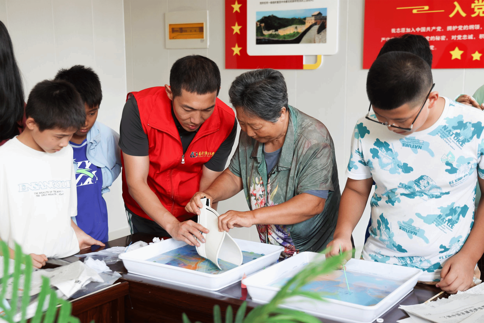 本站讯 8月19日,东营南岭村党群服务中心内热闹非凡,艺术设计学院师生正忙着向村民传授漆扇、水拓画技艺。这场 “非遗技艺三下乡” 实践活动,为早已凭借非遗项目实现创收的老街长巷再添新活力,通过打造游客 DIY 体验项目,让非遗技能成为乡村增收的新亮点。