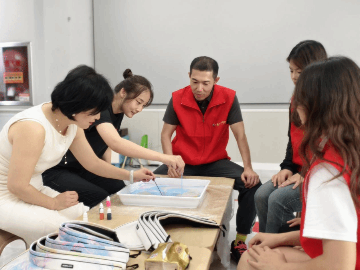 水拓画课堂同样精彩十足。队员们耐心引导孩子们用画锥拨动浮在水面的油彩,一个个充满想象力的图案在孩子们的小手下诞生,星空、海浪、花丛等意象跃然 “水” 上,随后这些图案又在帽子上定格。幼儿园教师不禁感慨:“孩子们从未如此专注。非遗不仅是技艺,更是打开创造力的钥匙。”