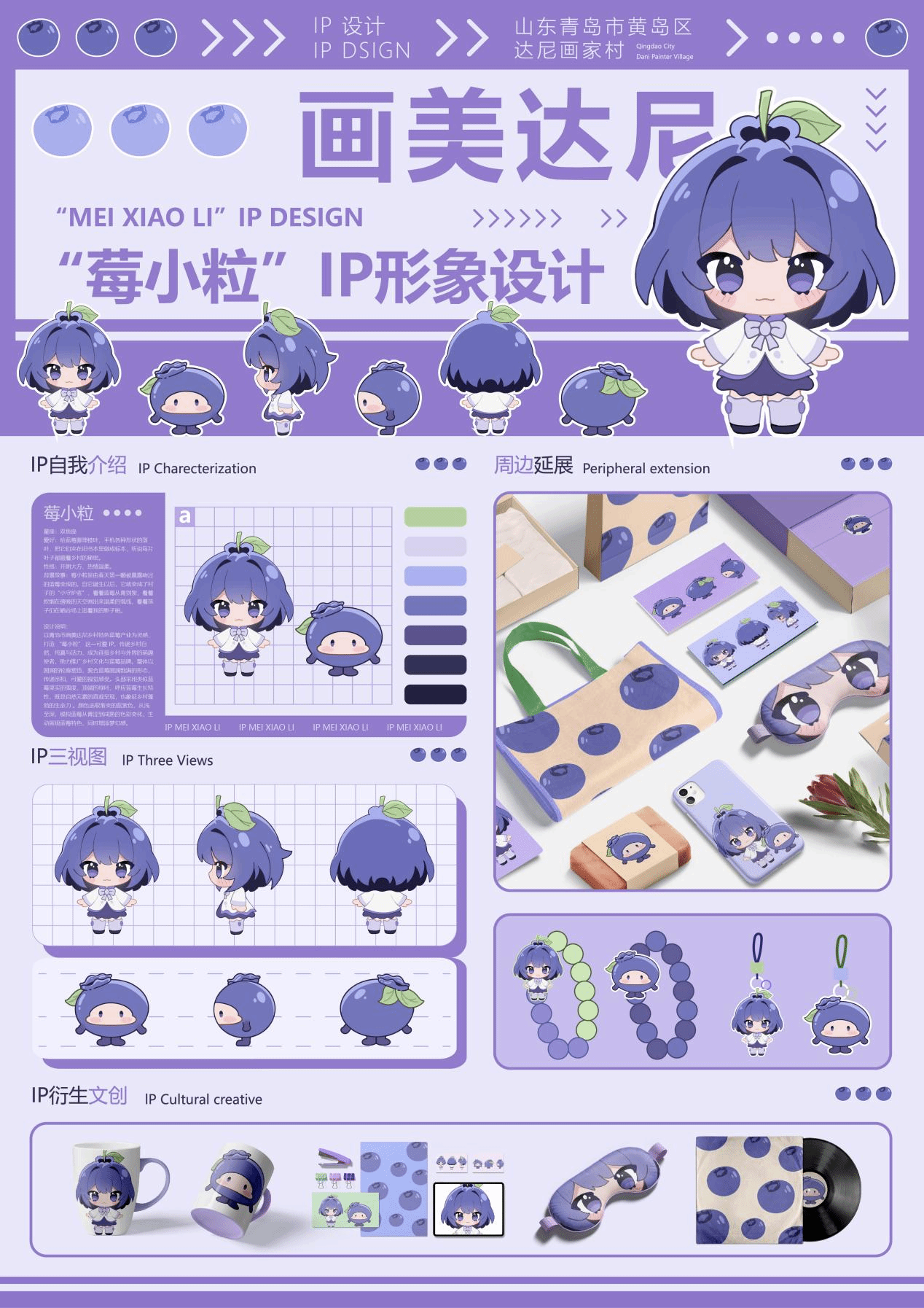 为提升达尼村文旅吸引力,团队设计村级IP形象“莓小粒”(以当地蓝莓产业为灵感),应用于导览标识、纪念品等场景;同时优化美术馆、艺术街区等公共空间的导视系统,设计统一风格的指示牌与地图手册。指导教师唐玮指出:“视觉系统的升级不仅能提升游客体验,更能强化达尼村作为艺术村落的品牌辨识度。”