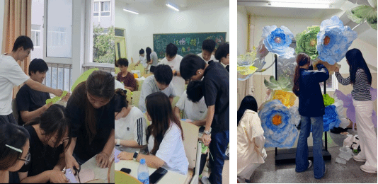 本站讯 艺术设计学院以课程创新为抓手,推动学生专业技能与综合素质协同发展。9月26日,24级环境艺术设计专业学生将《舞台布景设计》课程成果转化为校园实景,在1号教学楼B座扶梯区域打造“艺路生花迎国庆”主题布景展示,以专业实践献礼国庆。