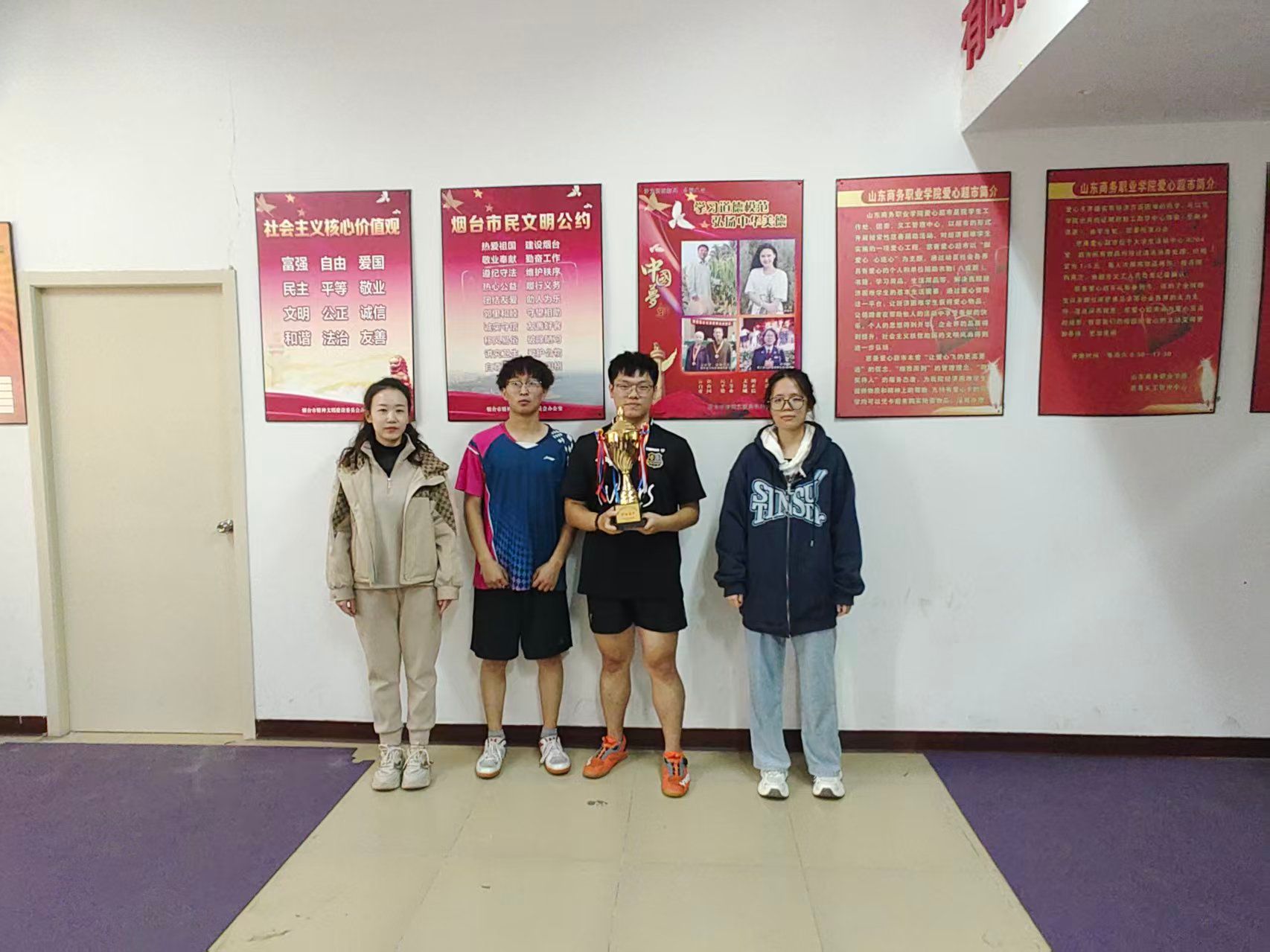 混合团体赛中,各学院代表队排兵布阵,默契配合,展现了出色的战术素养与团队凝聚力。经过激烈角逐,最终信息工程学院代表队凭借出色发挥夺得混合团体赛冠军,信息工程学院尚金栋、会计金融学院高新颖两位同学分别获男单、女单项目冠军。