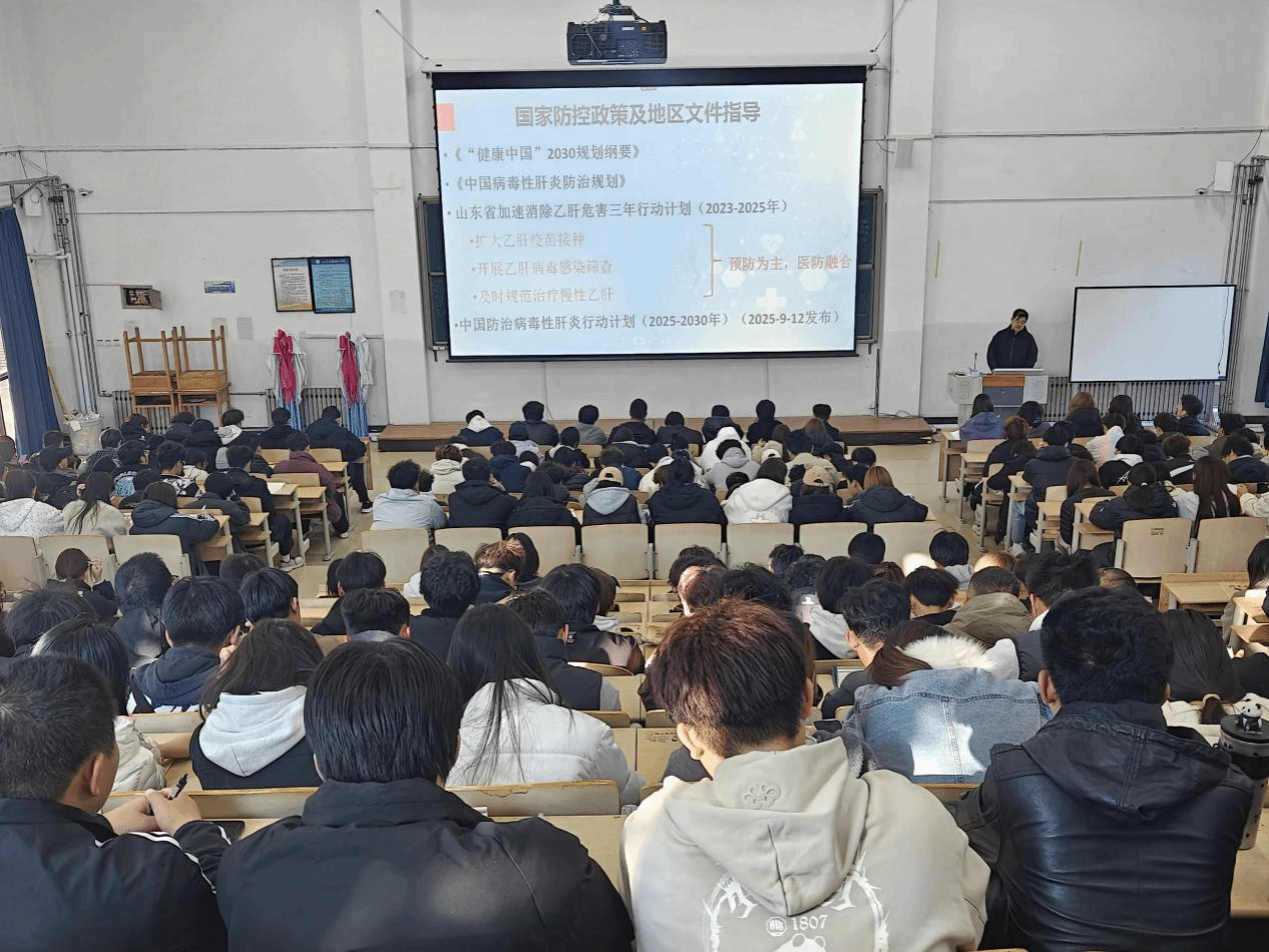 在乙肝防控板块,专家围绕《“健康中国”2030规划纲要》《山东省加速消除乙肝危害三年行动计划(2023—2025 年)》等政策文件,深入解读“预防为主,医防融合”的核心防控原则,着重强调新生乙肝病毒感染筛查的必要性,提醒抗体不足的同学及时完成疫苗补种,并从病毒性肝炎的种类、传播途径、感染后果及日常防护等方面展开细致讲解,让学生全面掌握科学防控方法。