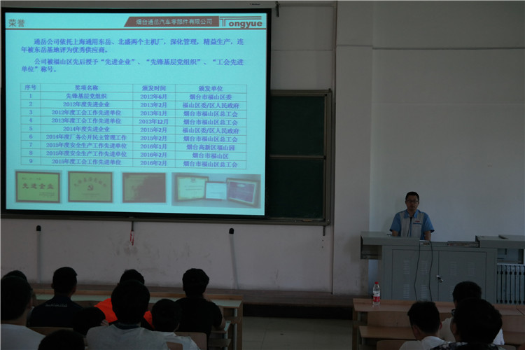 5月16日下午,通岳副总经理张玉庆、工会主席高鹏等一行领导来到我校面向2015级学生做订单班宣讲、面试。大家聚集在2号教学楼第2阶梯教室,听取了张经理对公司的详细介绍,最终数十人参与到企业面试环节。