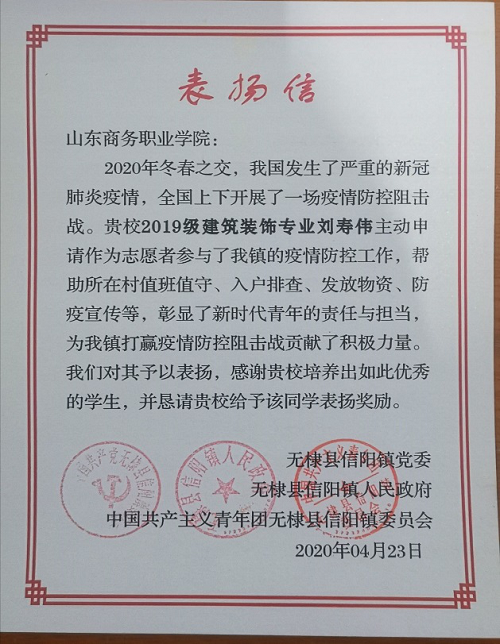 本站讯 自新冠病毒疫情爆发以来,建筑系多名学生积极响应党团组织号召,在做好个人防护的前提下,自觉自愿投身到家乡的疫情防控工作,勇担社会责任,在社区防控一线贡献自己的力量,受到当地共青团委等组织的感谢与表扬。