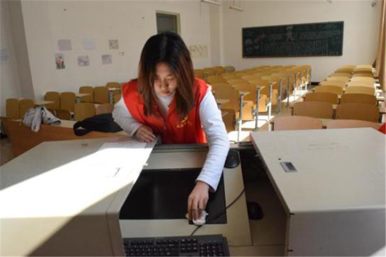 志愿者们齐心协力,干劲十足,不怕脏、不怕累,奋战在学院周边的各个角落。他们手拿扫帚和抹布等劳动工具,对多媒体设备内部杂物细心的清理清洁,对教学区周边的杂草、落叶认真清除打扫,不放过任何边边角角。
