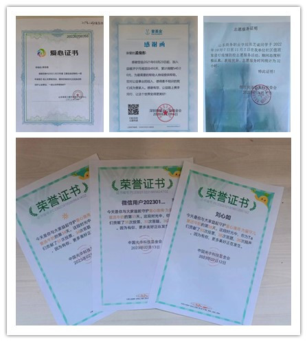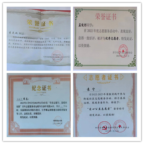 本站讯 近日,艺术设计学院先后收到来自共青团泗水县委、中国共产党山东佳居物业管理有限公司支委会、金乡县鱼山街道办事处、济宁市运河义工服务协会、即墨区潮海街道银华社区居委会、颜庄街道验货台居委会寄来了表扬信和荣誉证书,对我校艺术设计学院学生杨晓彤、李昊政、王琰喆、孟俊彤、袁宁、张芝诚积极参与春运服务、疫情防控、春节地方活动拍摄剪辑、关爱留守儿童、社区基层治理等志愿服务活动提出表扬和感谢;学院学生刘心如、陈梦钰、孙心茹、孟俊彤、侯佳旭积极参与“童心港湾.为留守儿童送牛奶”活动、益暖济宁月捐项目、关爱流浪动物线上志愿服务活动,分别收到中国光华科技基金会荣誉证书、深圳壹基金公益基金会感谢函、北京草原之盟环境保护促进中心爱心证书。