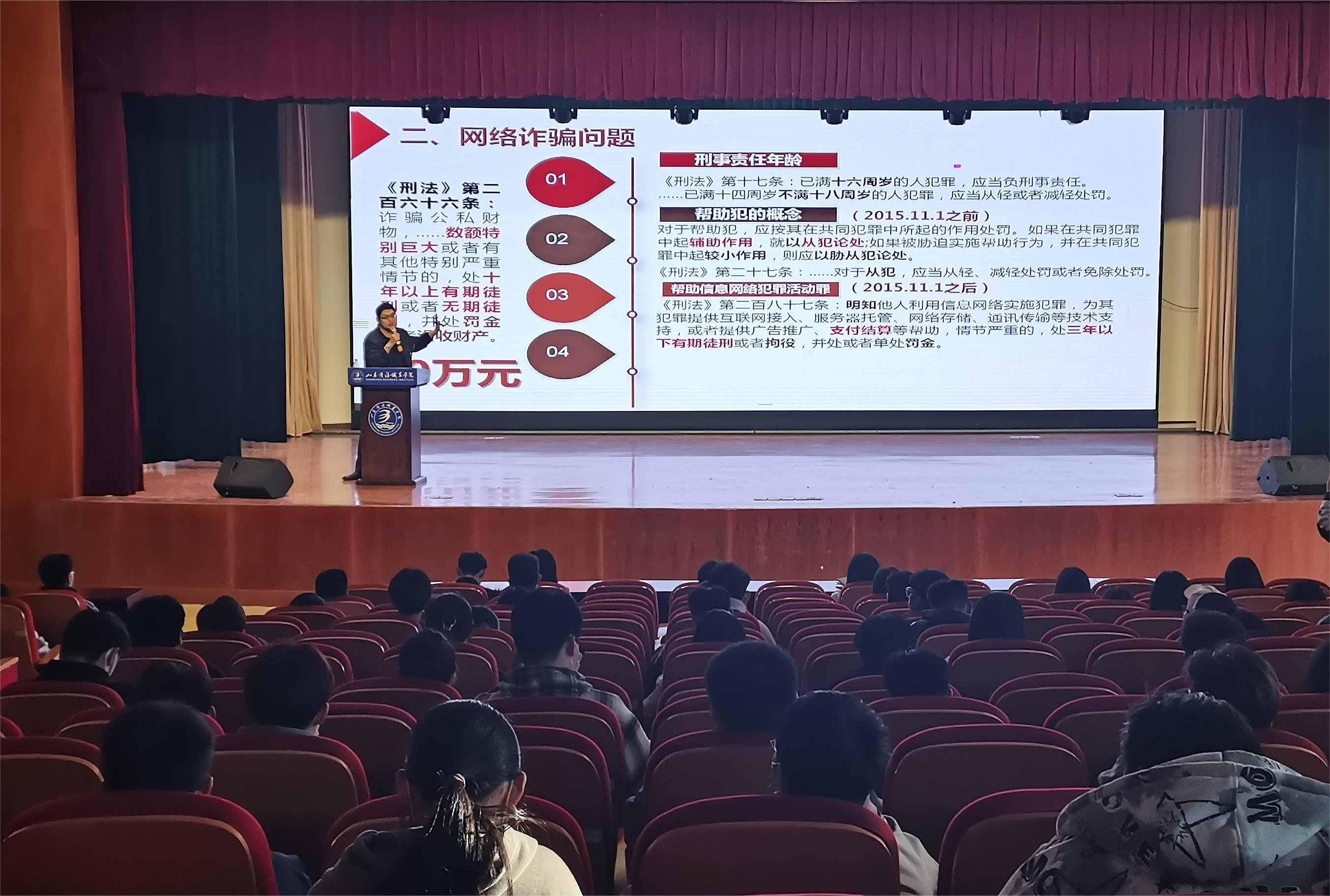 孙凯从国家和个人层面详细阐述了普及法律知识的重要性,通过讲解典型案例讲授法律常识,倡导同学们要树立遵法守法意识,提升法治素养,培养法治思维,加强法治建设认同感。孙凯结合当前社会和校园周边存在的安全隐患,通过法条解读、案例解析相结合的形式,分别从网络诈骗、校园暴力两个视角以个人经历、时事热点、经典案例方面深入剖析了违法犯罪行为的发现和预防、定性和处理、解决和总结等具体内容,启发学生深入思考。最后,孙凯倡导青年大学生要学会用法治思维武装头脑,将个人发展融入到法治社会建设中去,用法律武器保护自身合法权益,让法律保障每一名同学的人生行稳致远。