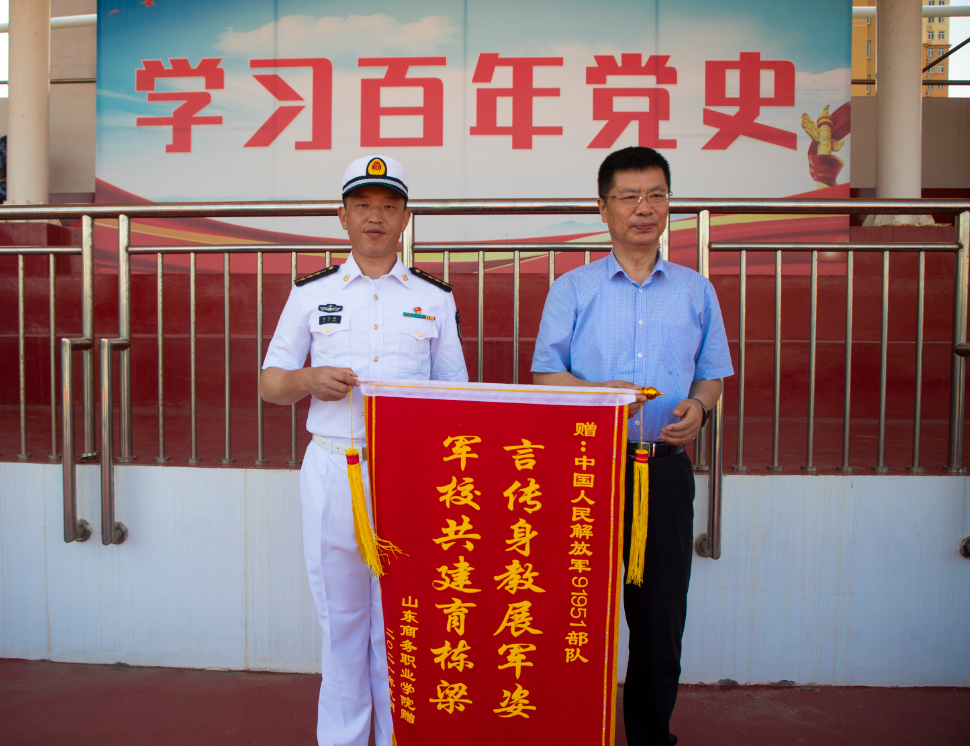 随后,我校党委书记耿建敏向承训部队赠送锦旗。“言传身教展军姿,军校共建育栋梁”,寥寥数语道不尽学校领导师生对军训基地领导教官辛勤付出的衷心感谢,更见证了长期以来一直担负着我校新生军训任务的承训部队与商务师生的深厚友谊。