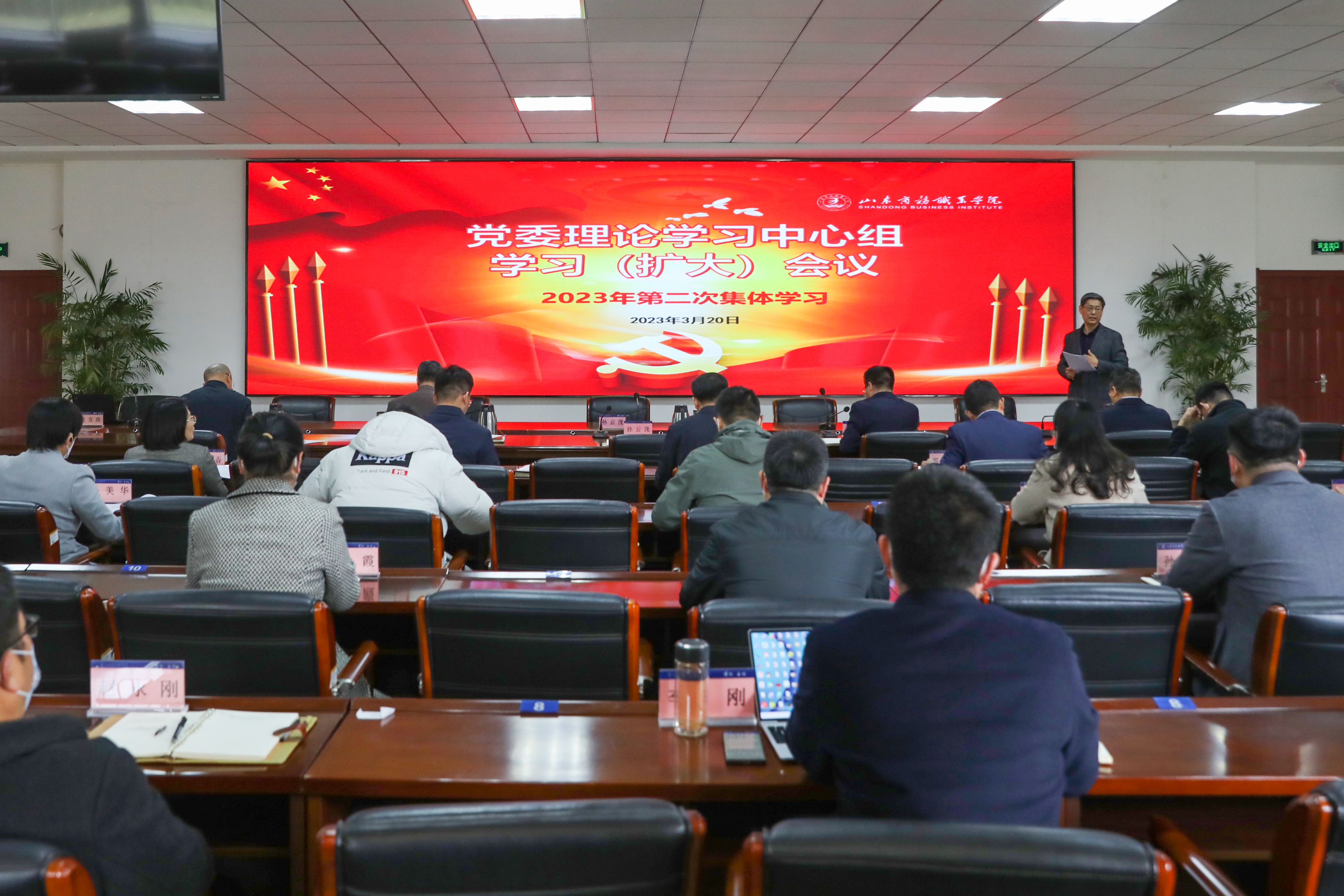 本站讯 3月20日,学校在办公楼学习中心召开党委理论学习中心组学习(扩大)会议,专题学习全国两会精神和山东省职业教育办学质量考核相关文件精神。党委书记孙云茂主持会议并讲话,党委副书记张越、副校长陶传蔚作主题发言,党委理论学习中心组成员参加会议。各处室、教学部主要负责人,各二级学院党政负责人,济南校区主要负责人列席会议。