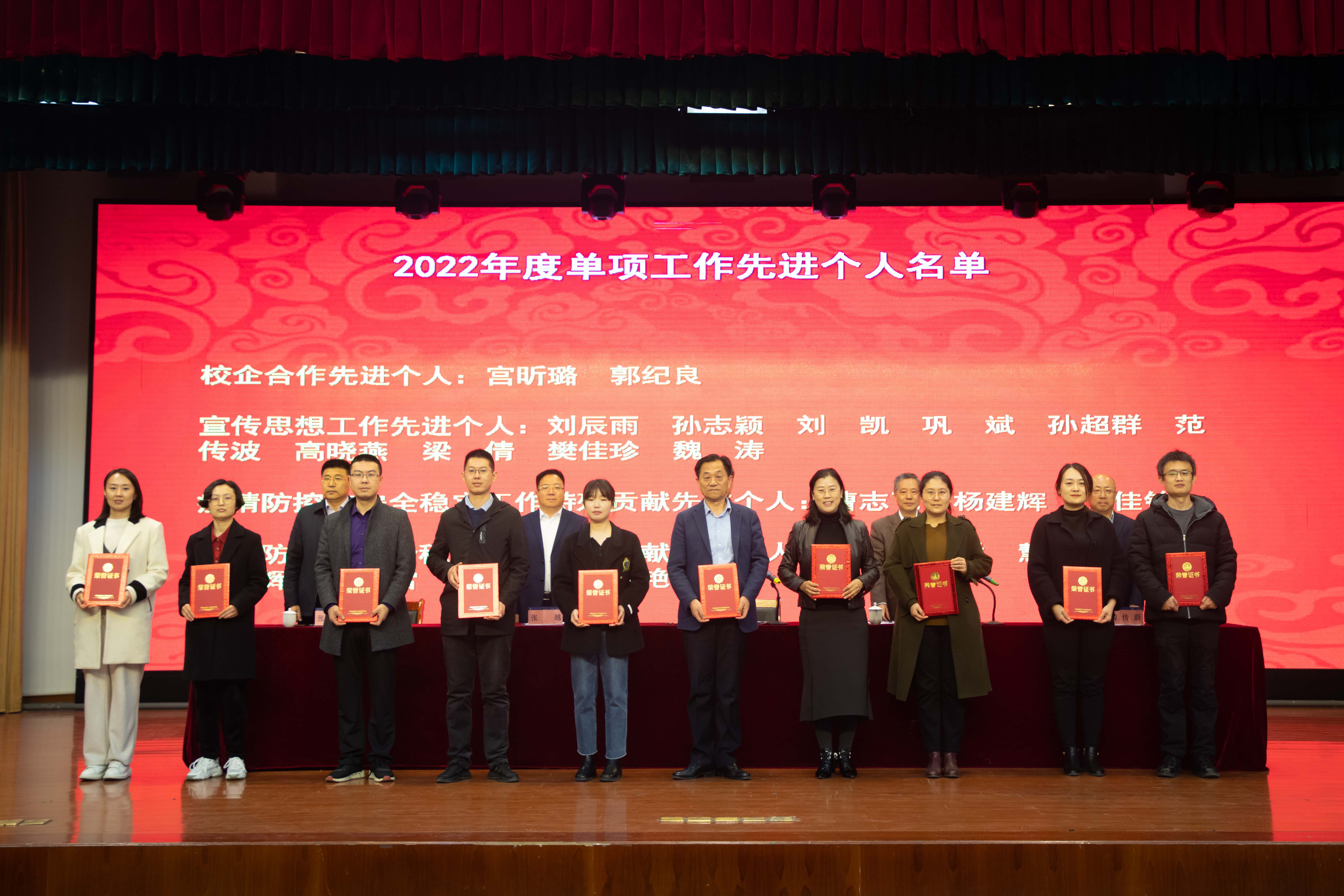党委副书记、校长王发明向受到表彰的先进集体和个人表示热烈祝贺。在总结过去一年奋斗历程的基础上,王发明就做好2023年重点工作强调了四点意见:一是要对标对表,踔厉奋发,稳步实现办学质量考核保档进位;二是要踏实苦干,奋勇争先,持续推进产教融合、科教融汇;三是要规范管理,挖潜增效,全面提升学校财务保障能力;四是要守牢底线、不越红线,全力做好学校各领域安全工作。王发明要求,要扎实推进党的二十大精神在学校落地见效,全面实现全年发展目标。