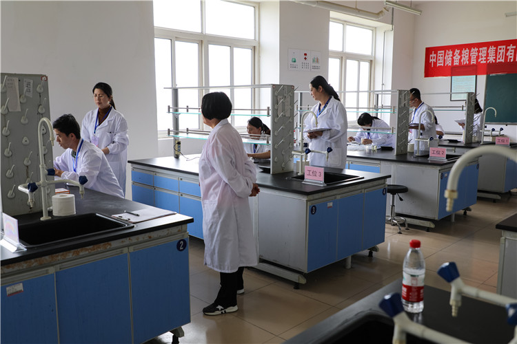 竞赛从保障国家粮食安全和一线工作实际出发,设置(粮油)仓储管理员和农产品食品检验员两个职业,设置技能操作比赛和理论考试比赛两部分竞赛内容。除了考察选手的理论水平,还重点考察选手的实践动手能力。在(粮油)仓储管理员比赛区,选手根据比赛要求对储粮通风机的参数进行测定,并对风机设置的合理性进行评价。在模拟仓按管理要求测定仓内氧气含量佩戴正式空气呼吸器检查气调储粮杀虫效果。在农产品食品检验员比赛区,样品称量项目拼的是手速,看选手在规定的时间内谁的样品数称量的最多。稻谷脂肪酸值的测定要求选手严格遵守检验流程,准确快速滴定,检验结果准确。来自山东全省中储粮系统的18支代表队,76名选手参加决赛。