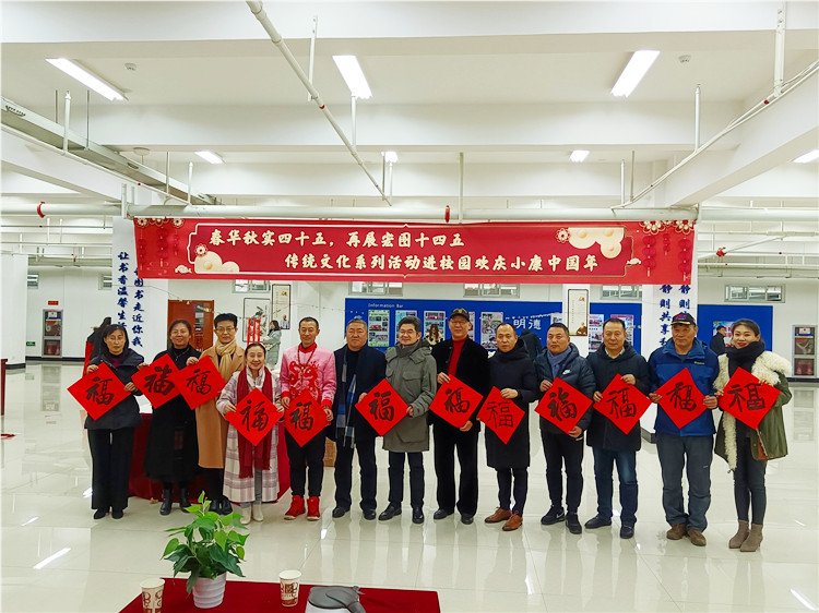 本站讯 为了贯彻落实十九届五中全会关于繁荣发展文化事业和文化产业,提高国家文化软实力的会议精神,同时庆祝我校建校45周年,展望十四五宏伟蓝图,迎接农历辛丑牛年的到来,我校图书馆、基础教学部和宣传统战部于12月21日下午联合举办了主题为“春华秋实四十五,再展宏图十四五”传统文化进校园活动。来自烟台的鲁绣非物质文化遗产代表性传承人张京艳先生,烟台市胶东民间艺术博物馆副馆长刘子瑛女士和藏品部主任鲍艳霞女士,烟台民间文艺家协会剪纸艺术委员会副会长胡文先生,烟台著名记者、作家、主持人尹浩洋先生,烟台著名书法家赵向森等一行7人,烟台集邮联谊会中国梦活动中心副主任王伟韬先生,烟台人民广播电视台著名节目主持人刘丽老师等艺术家出席活动,我校副院长陶传蔚,图书馆馆长李颖,基础教学部主任王九福,宣传统战部部长孙芹宝一同出席。