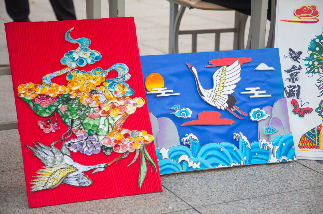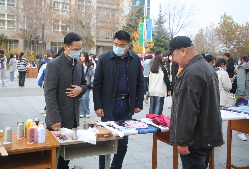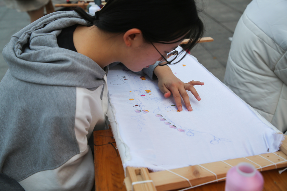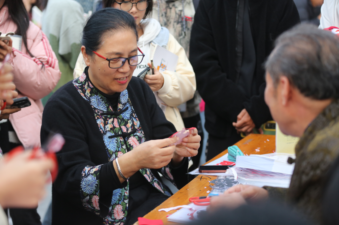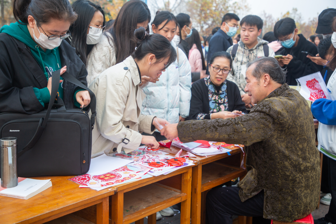 鲁绣非物质文化遗产传承人张京艳和剪纸传承人韩月湖两位大师受邀而来,向学生展示了鲁绣、剪纸技艺,其精湛的技艺、精美的作品,更是吸引了众多学生前来观看、学习和体验。