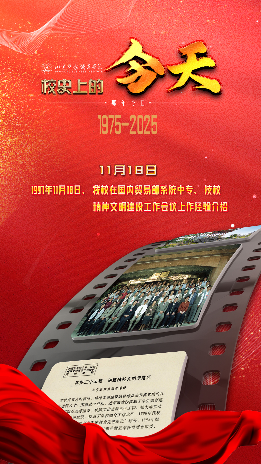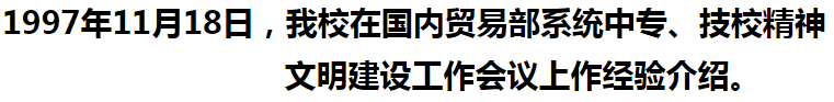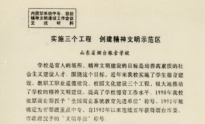 1997年11月18日-20日,国内贸易部教育司在广西南宁召开国内贸易部系统中专、技校精神文明建设工作会议。全国共计有85所学校代表参加了此次会议。大会指定山东省烟台粮食学校在会上重点进行经验介绍。时任山东省烟台粮食学校党委书记李绍贤同志代表学校出席会议,从实施学生德育建设工程、职工职业道德建设工程、校园文化建设工程三个方面,作出了《实施三个工程 创建精神文明示范区》的交流发言。李绍贤同志表示:党的十五大对精神文明建设提出了更高的要求,学校会继续联系学校实际,探索加强学校精神文明建设的新思路、新途径,学习兄弟学校的好经验,加大实施三个工程的力度,把山东省烟台粮食学校创建精神文明示范区的活动搞得更好。
