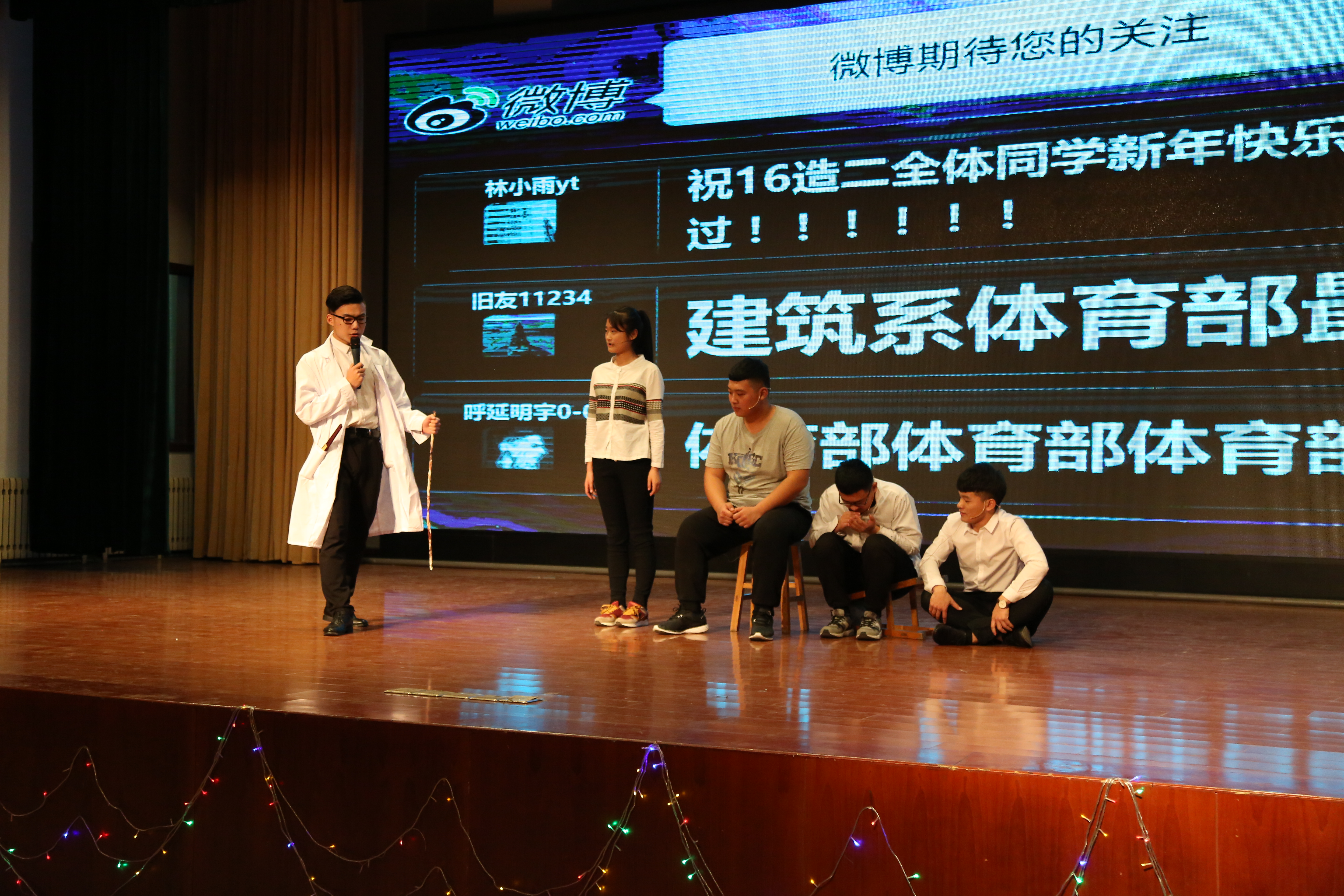 伴随着倒计时,彩花的飞舞,节目正式开始,文艺部与各部部长带来的一首《新年大吉》,瞬间将现场带入了节日的气氛,随后带来的热舞表演也掀起了一阵小高潮。朗诵节目《中国梦青春梦》体现了国家意志与个人感情的和谐共鸣,凝聚了建筑系学子对祖国的深深祝福和强烈的挚爱;随后由自律部同学们带来幽默诙谐的小品《手机综合症》戳中了观众们的笑点,笑声在音乐厅内久久环绕;紧接着自律部和安保部带来的舞蹈把气氛推向高潮,展现出了同学们的青春活力;穿插于晚会的抽奖环节与游戏环节更是吸引了现场观众的积极参与,台上台下气氛高涨,互动不断。最后,晚会在一首《让爱住我家》中温馨结束,本次元旦文艺晚会也圆满落下了帷幕。(曲佳凤 贺俊祥)