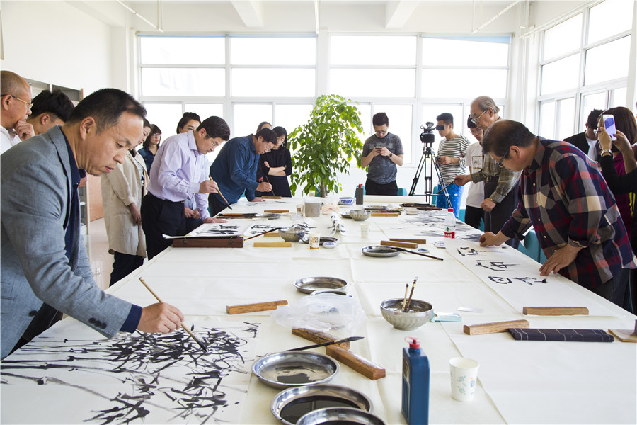 由图书馆邀请烟台书法家协会的大师们现场作画,精彩技艺吸引了众人的目光,博得来访人员的阵阵掌声。