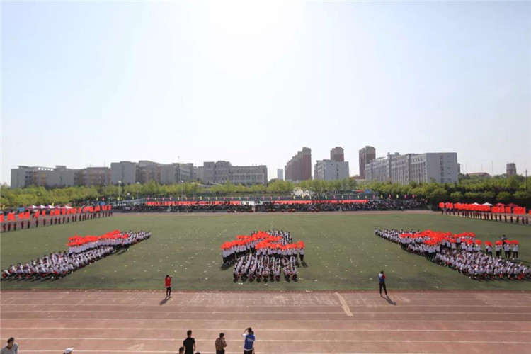 团体操表演以狮子舞开场,再现了我们商务人不屈不挠、奔腾争跃、喜气祥和的精神面貌。由信息艺术系、机电工程系、食品工程系三个系共800名同学带来的团体操表演动作整齐划一,节奏感强烈,让人眼前一亮:800名同学沐浴明媚的春光,迎着欢快的音乐,他们手持火红的扇子,奔向操场的中央,翻飞舞动的扇子抒发着生命的喜悦,舒展大方的动作洋溢着生命的欢快。运动场上,他们组成的九道方阵,恰似彩色的海洋,一个个充满青春活力的青年挥动着彩扇,熠熠生辉。表演队伍变成了大花园的图案,寓意“渊源共生,和谐共融”,预示着我们学校更加辉煌!圆中圆,大同心圆,围绕不变的中心点,串成九个同心圆,是希望、拼搏、勇气、守望,把我们的奋力拼搏的心串联在一起,串成梦想之圆。随后,表演队伍变换出“十九大”以及“S””W”的图案,寓意我们山东商务职业学院在党的十九大的光辉指引下,在学校党委的正确领导下,一定会魅力四射,奏响高职院校最强音!