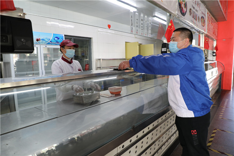 学生在餐厅入口处间隔1米有序排队、进行体温测量,体温正常进入餐厅。学生按照餐厅地面标识有序排队取餐,取餐后到餐桌就坐用餐,单人单桌、同向就坐。学生就餐时自感体温异常,立即打电话给辅导员,辅导员电话报告所在餐厅联络员、总务处。餐厅联络员立即停止入口处人员进入,引导到其他餐厅就餐,组织登记体温异常者周围5米内餐桌就餐人员和各窗口工作人员信息。引导其他就餐人员有序离开餐厅。辅导员到达餐厅将异常学生引导至临时留观点。总务处安排医护人员到达临时留观点,医护人员对体温异常学生进行体温检测和症状检查,确认异常,立即报告学校疫情防控领导小组,启动应急处置。医护人员联系120救护车将异常者送往滨医附院就诊。消毒人员对餐厅和临时留观点进行消毒。