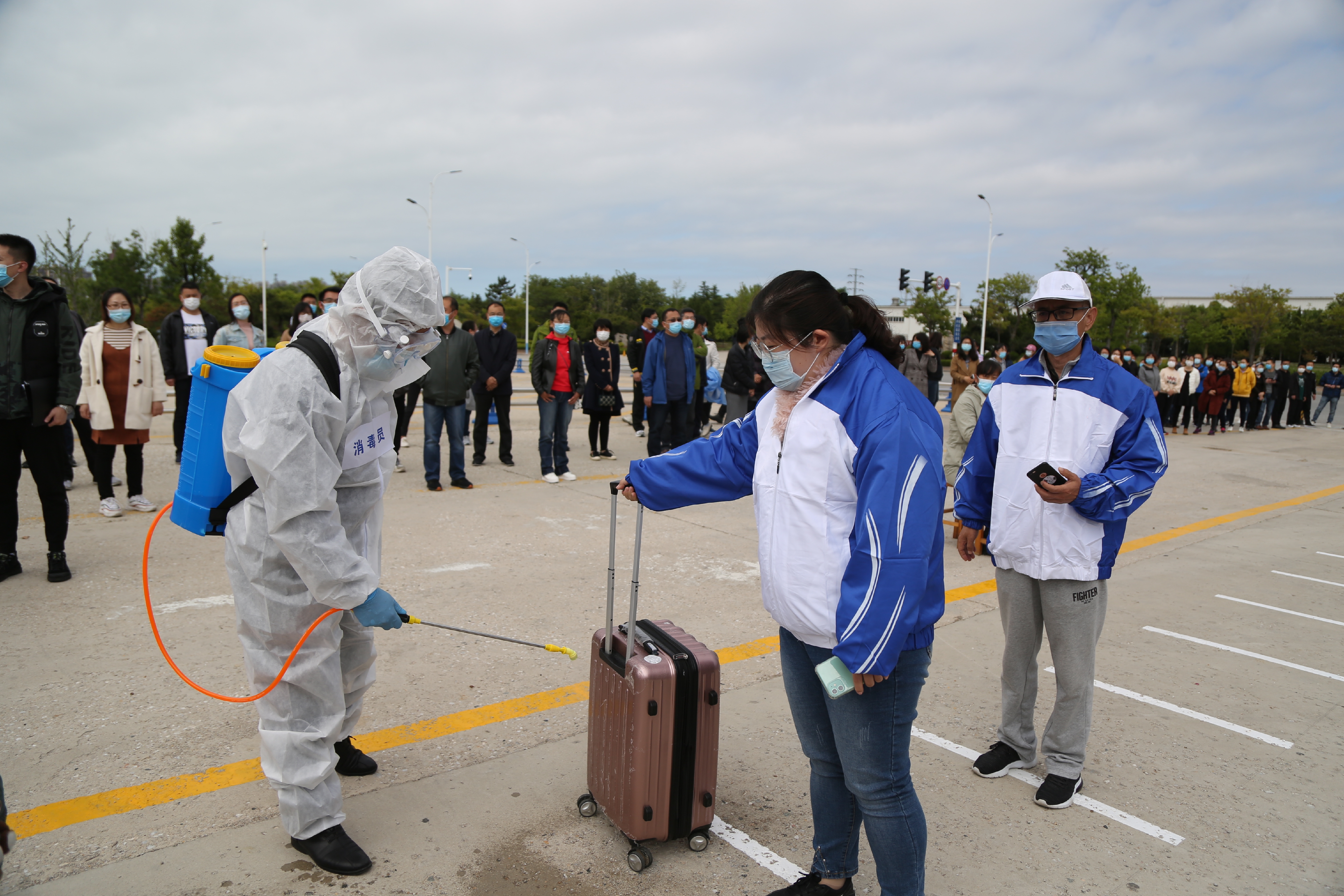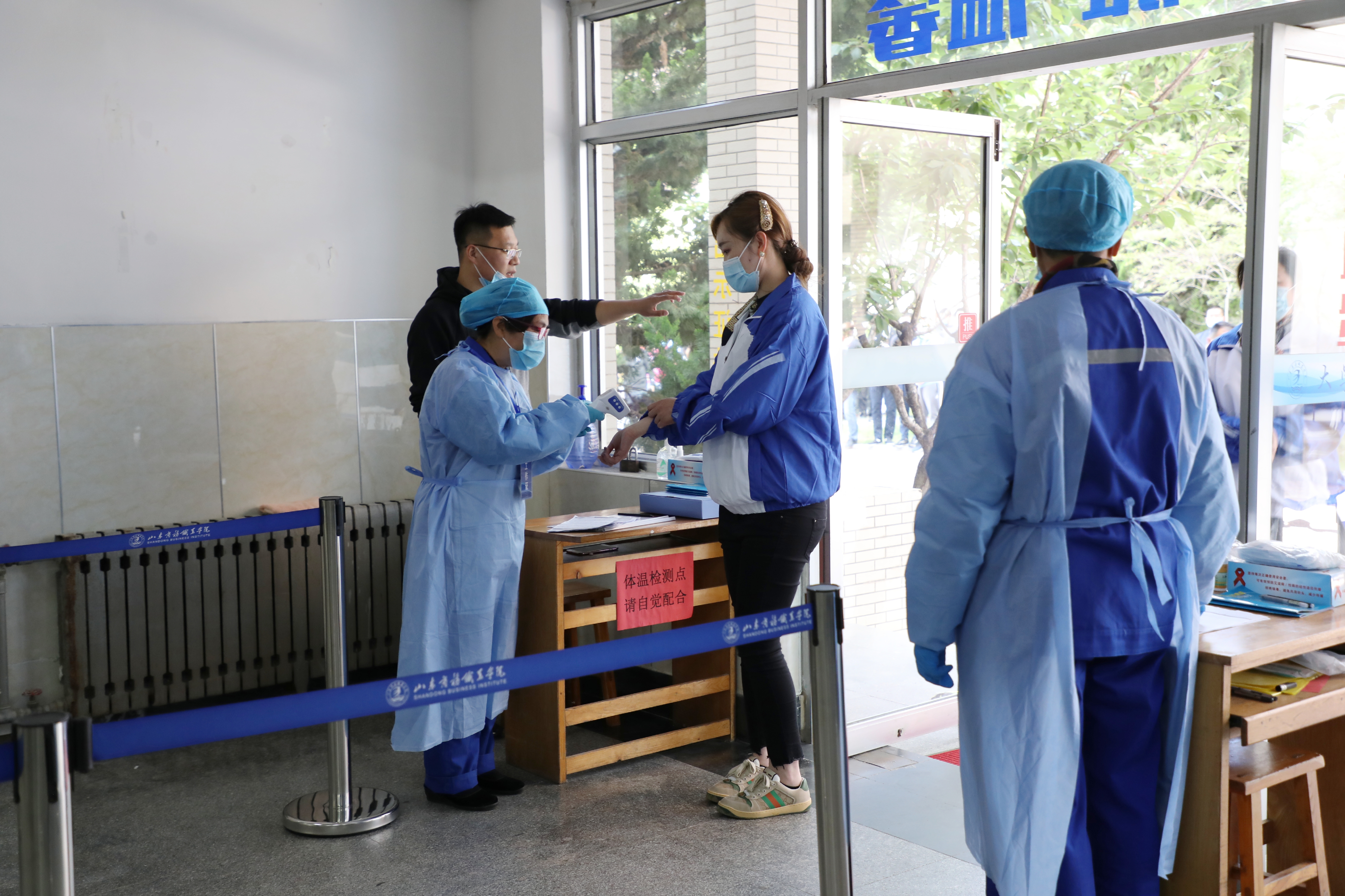 学校东大门口依次设置下车区、入校通道、测温区、消毒区、身份核验区、临时留观室等区域。学生下车后间隔1米有序排队,在测温区测温员依次测量体温,在消毒区进行行李消毒、鞋底消毒、手部消毒,在身份核验区工作人员对学生的健康通行码及学生证进行查验,上交健康备档卡、承诺书等材料。体温正常、信息确认无误学生进入校园。如发现体温异常学生由测温人员引导至临时留观点,医护人员进行体温复测和症状检查、流行病学史调查、信息上报、联系120送医就诊、通道和临时留观点消毒。