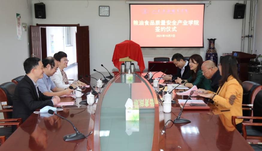 本站讯 为持续提升产教融合、校企合作水平,更好地促进学校与企业发展,10月7日下午,粮油食品学院与烟台富美特信息科技股份有限公司(食品伙伴网)在办公楼会议室举行粮油食品质量安全产业学院签约仪式及揭牌仪式。烟台富美特信息科技股份有限公司董事长李远钊、学校副校长陶传蔚、校企合作与就业工作处、粮油食品学院领导及相关负责人出席签约仪式。