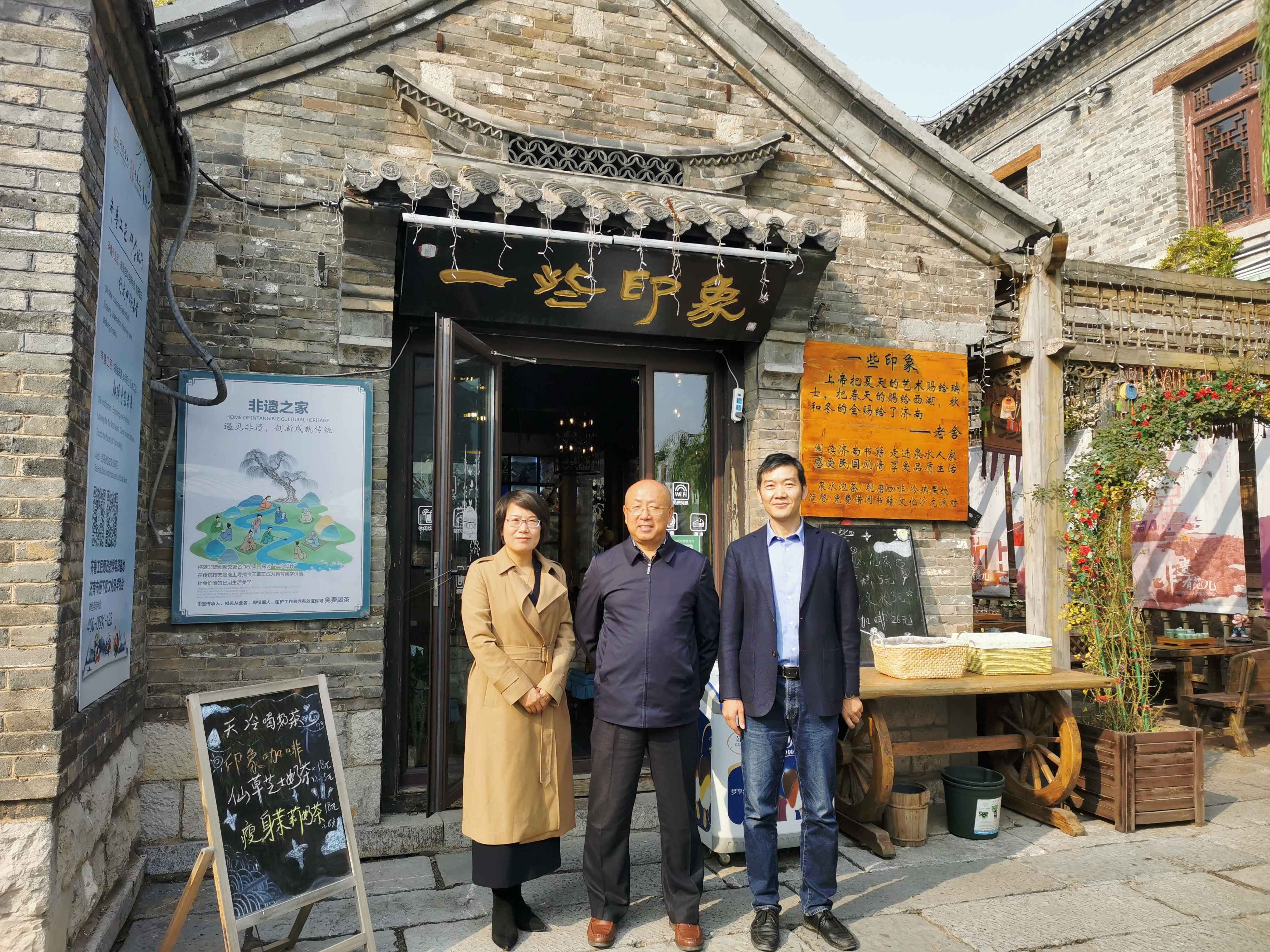 本站讯 10月30日,学校副校长陶传蔚访问了济南百花洲后宰门非遗文创产业聚集区,与百花洲负责人、省精品旅游促进会非遗文创产业专业委员会主任巩茜、山东华仁教育总经理张俊建就非遗文化的传承、产业化、国际化、人才培养和校企合作进行了深入讨论,并参观了百花洲后宰门街的创意产品。